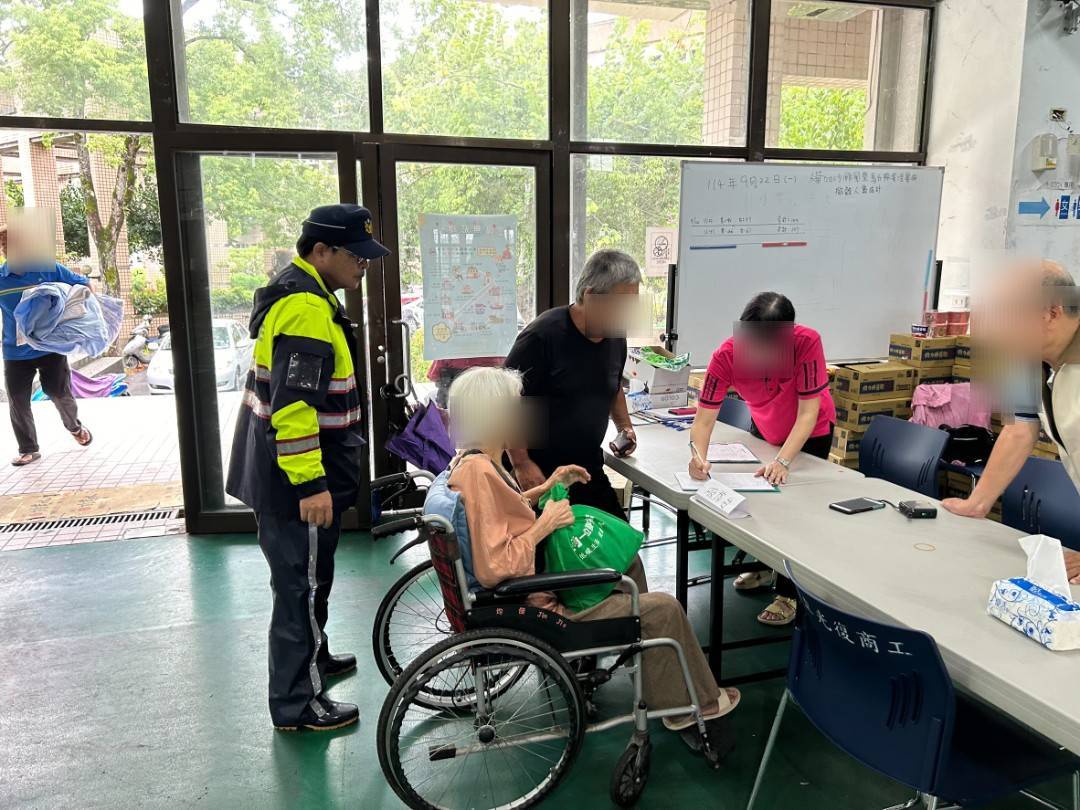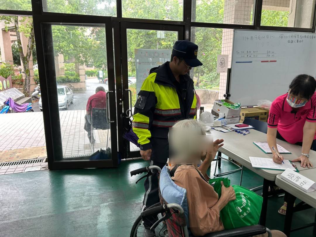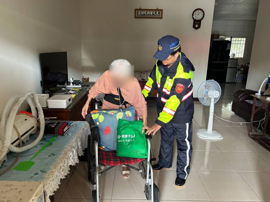 警方立即停車並下車查看,經詢問老奶奶表示因獨自一人在家裡,深怕颱風來臨會有危險,因其行動不便無法自行前往收容所,小孩都在台北沒有人可以幫忙,遂請警方載她前往光復高職收容處所避難,警員潘可浚、楊勝裕便攙扶老奶奶上巡邏車,老奶奶帶著她的應急藥物、手機等物品,由警方開著巡邏車載往光復高職順利安置,老奶奶對於警方及時的幫助連連道謝,感謝萬分。