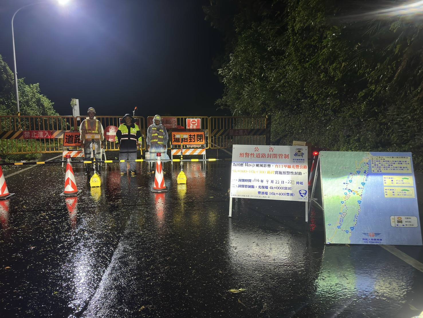 為因應颱風樺加沙帶來強風豪雨,花蓮縣警察局鳳林分局配合公路局花蓮工務段決定,針對光豐公路(台11甲線3.6k~16k)於21時實施預警性封閉措施(只出不進)並於22時實施全面管制,禁止車輛及行人通行。請民眾務必配合封路管制,切勿擅自進入封閉路段,以免發生危險。