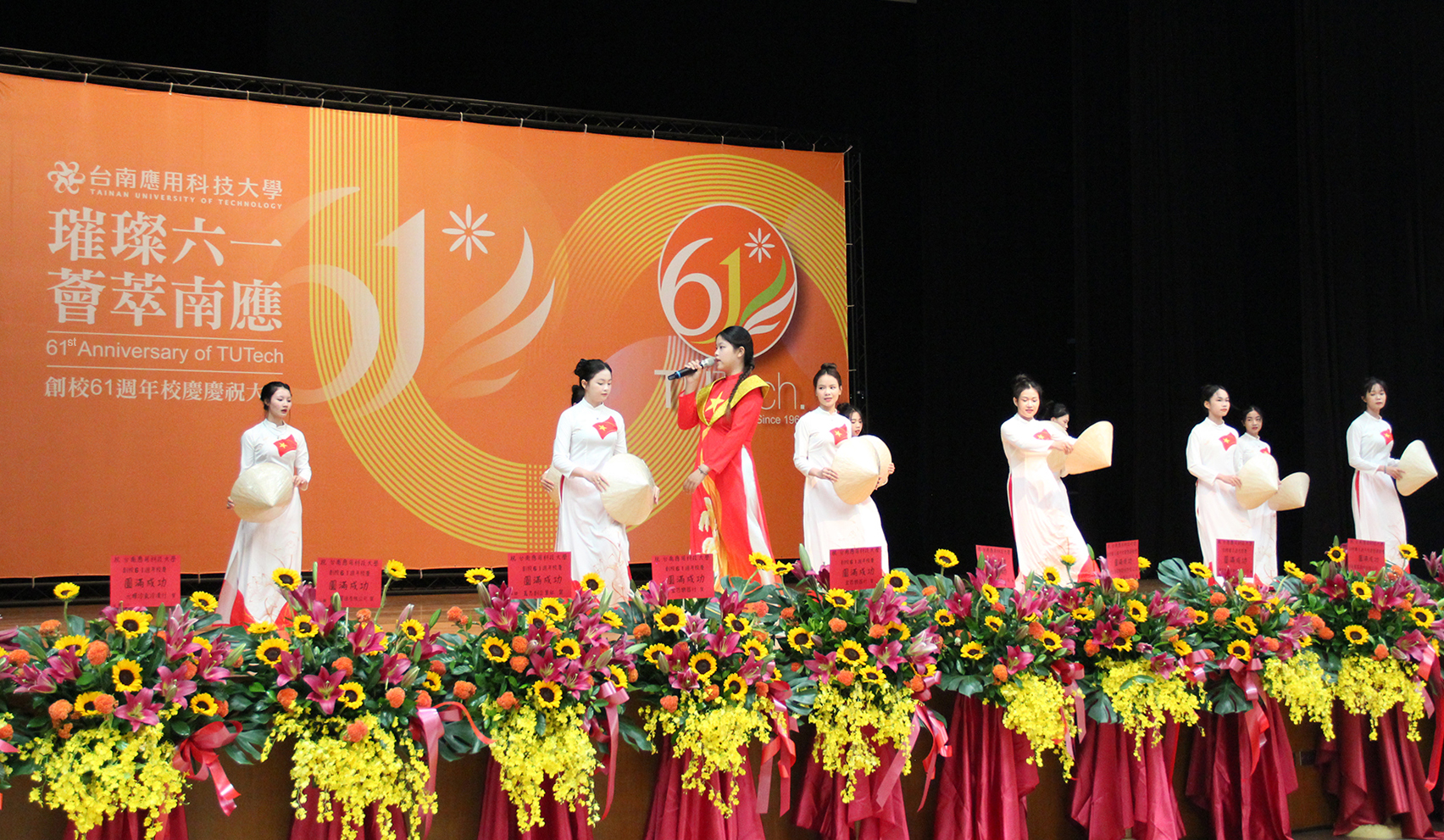此外,外籍學生登台進行傳統服飾文化走秀與歌唱演出呈現異國風情之美,並傳遞了南應大對照顧外籍學生無微不至的感謝;而由學生社團表演「嘻哈熱舞韓舞勁舞團」,動感十足、青春洋溢;壓軸由流行音樂系登場,以幾首勁曲帶動全場嗨翻天,將典禮熱度推至高潮,完美詮釋「薈萃南應」的多元與能量。