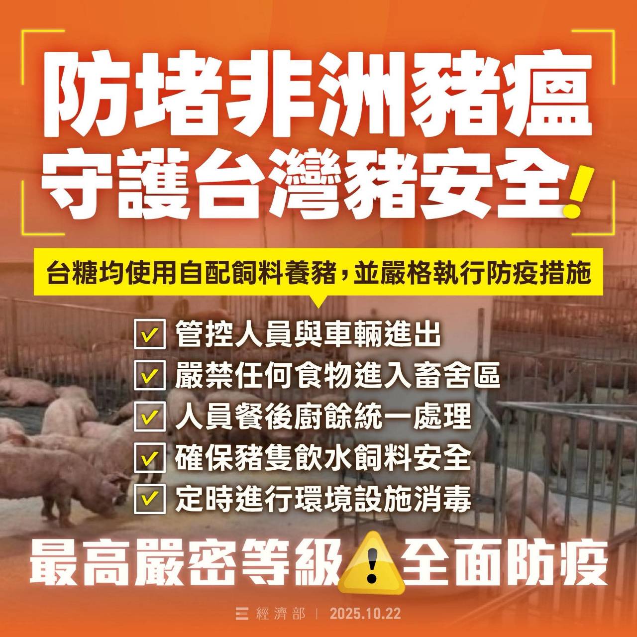 過去,台糖也有成功防制過非洲豬瘟,這次,經濟部也會協助台糖,配合農業部指示,全面禁運、加強衛生管控、齊心防堵。