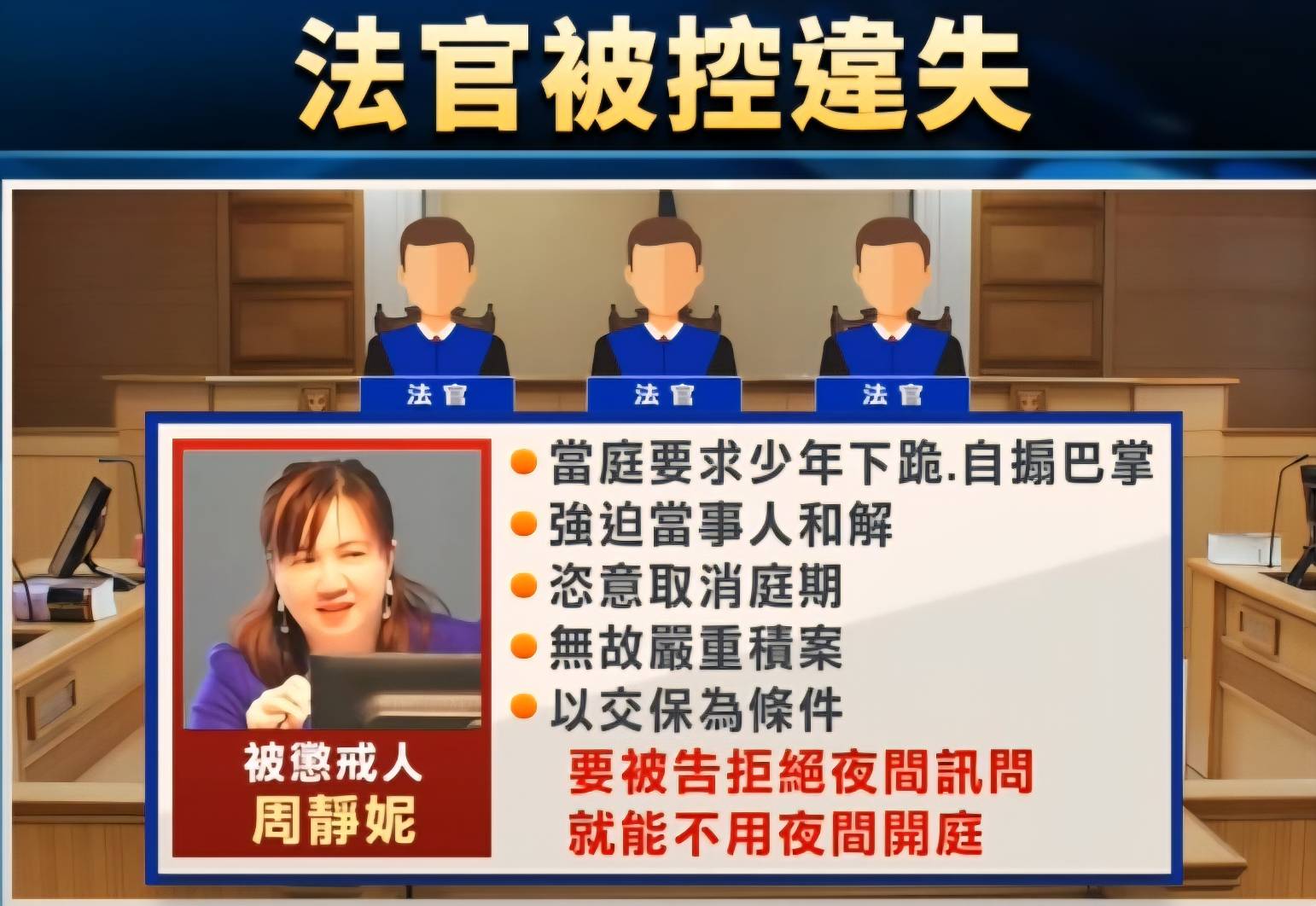 被付懲戒人周靜妮於任職臺灣苗栗地方法院(下稱苗栗地院)法官期間(已辭職),有移送機關司法院、監察院所指如附表各編號所載違失行為:(一)值班受理聲請羈押案件,無故未即時到院訊問,或以允諾交保換取被告同意不為夜間訊問,或以個人事由一再展延庭期(編號1、19)、(二)收容逾期(編號7)、(三)要求案內少年掌摑、下跪,並以言語恫嚇、性羞辱案內少年(編號5)、(四)揭露職務上知悉且應予保密之資訊(編號8、12?)、(五)以不當方式勉強當事人和解(編號11)、(六)製作內容不同之雙重判決,以規避研考規定(編號9)、(七)倚仗職務要求所轄書記官及法官助理為其處理個人事務、以差假批核要求法官助理撰寫特定內容之自白書(編號13)、(八)為處理私務或無故恣意取消庭期,影響當事人權益(編號6)、(九)無正當理由延滯大量案件未進行,影響當事人權益(編號20至22)、(十)於所承辦之各案件中有諸多如判決事實與理由矛盾、未依法指定輔佐人、訴訟程序違法等重大違反法律規定、辦案程序之違誤(編號2?、3、4、10、15至18)、(十一)將借調卷證攜出法院外影印(編號14)、(十二)遲未辦畢移交及離職手續(編號23)等,損及法官職位尊嚴及司法機關形象。經司法院移送及監察院彈劾移送本院職務法庭合併審理。