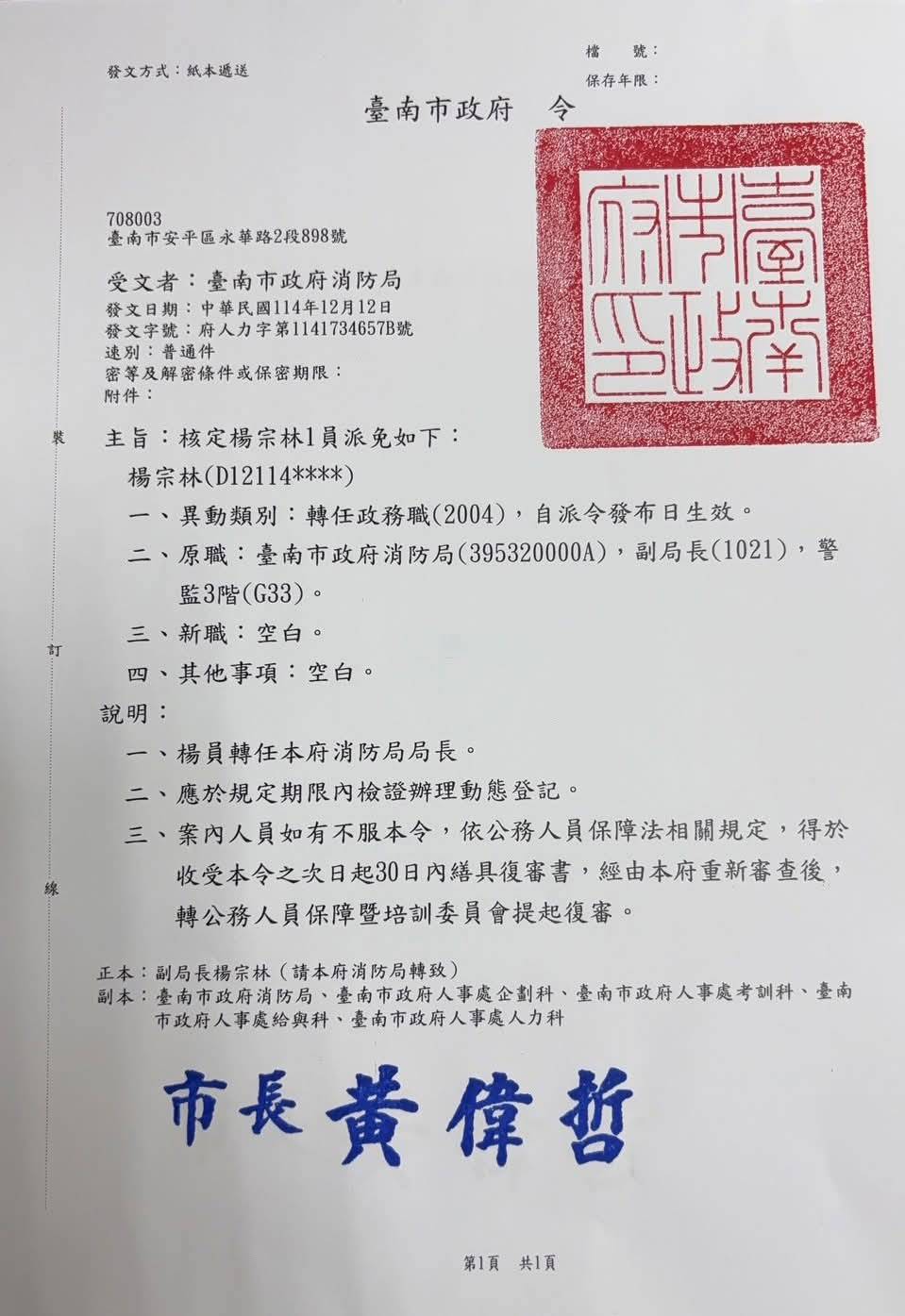 台南市消防局長李明峰今(12)上午突然傳出請辭消息,台南市長黃偉哲一度慰留不成,台南市政府公文核定,由台南市消防局副局長楊宗林接任消防局長一職。 圖片中