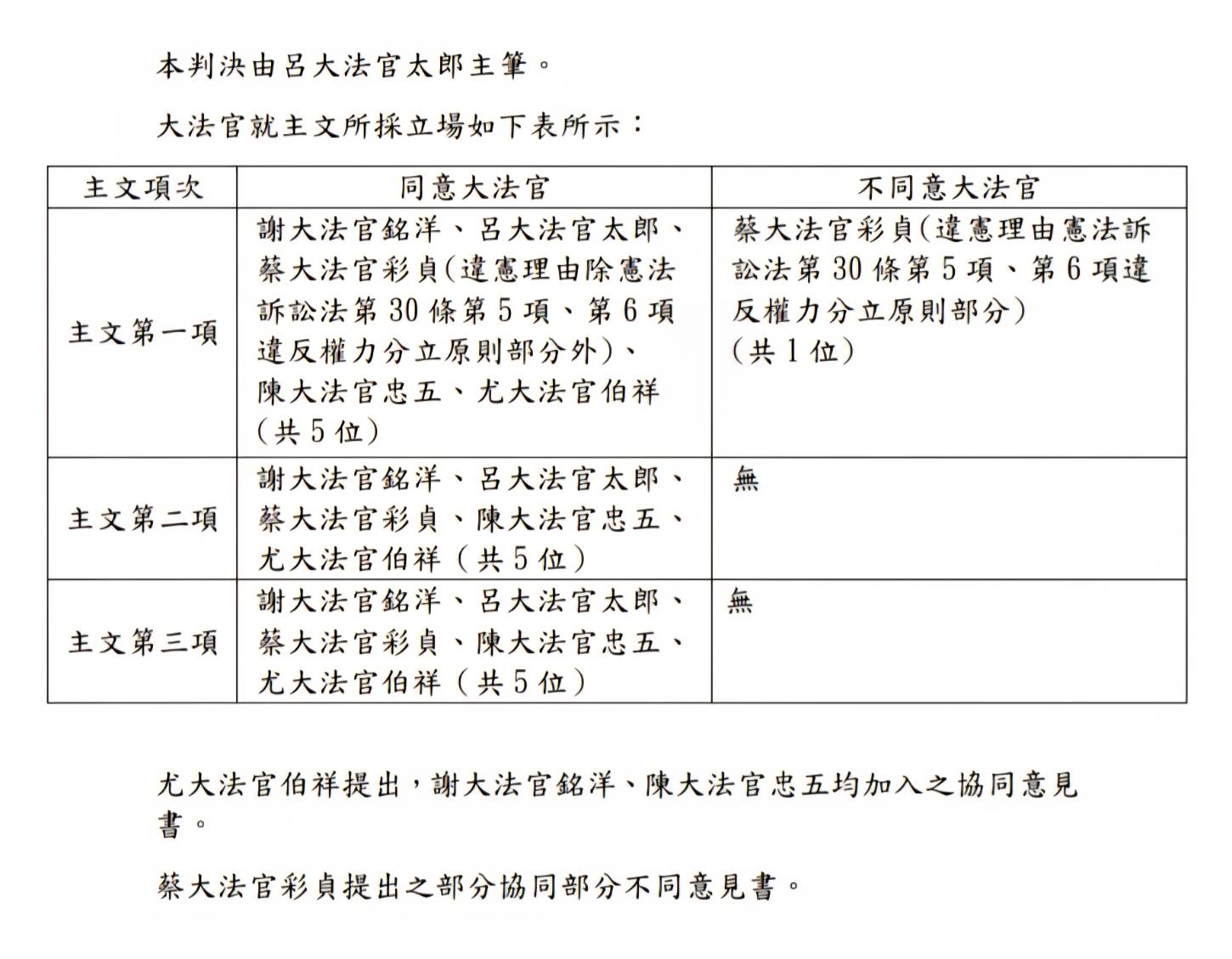 本判決由呂大法官太郎主筆,計有尤大法官伯祥(謝大法官銘洋、陳大法官忠五均加入)提出協同意見書,蔡大法官彩貞提出部分協同部分不同意見書。