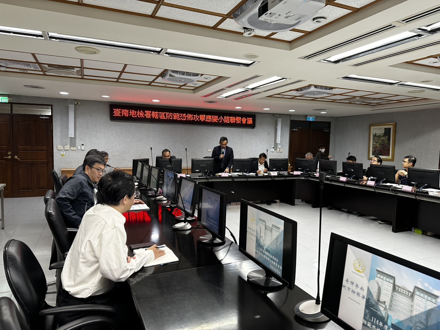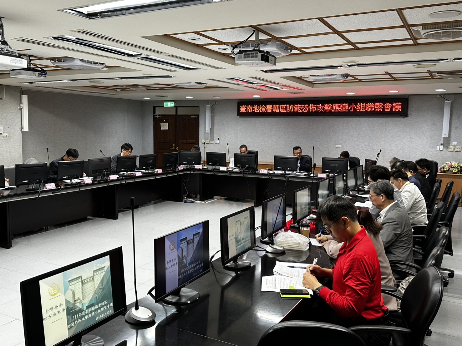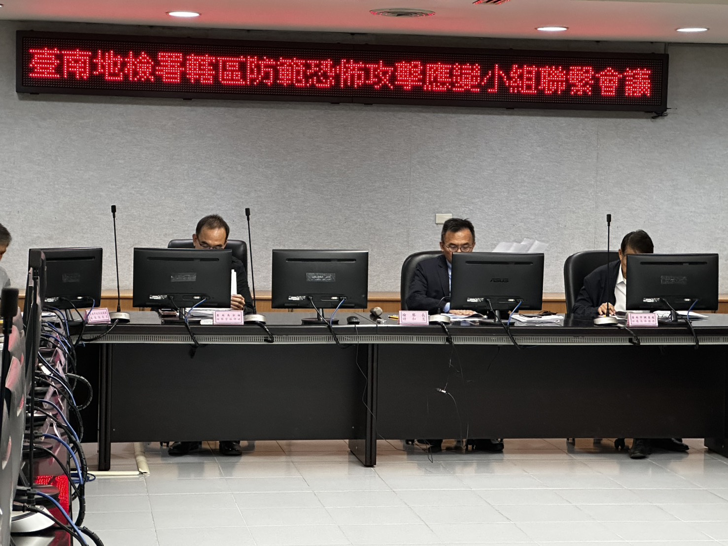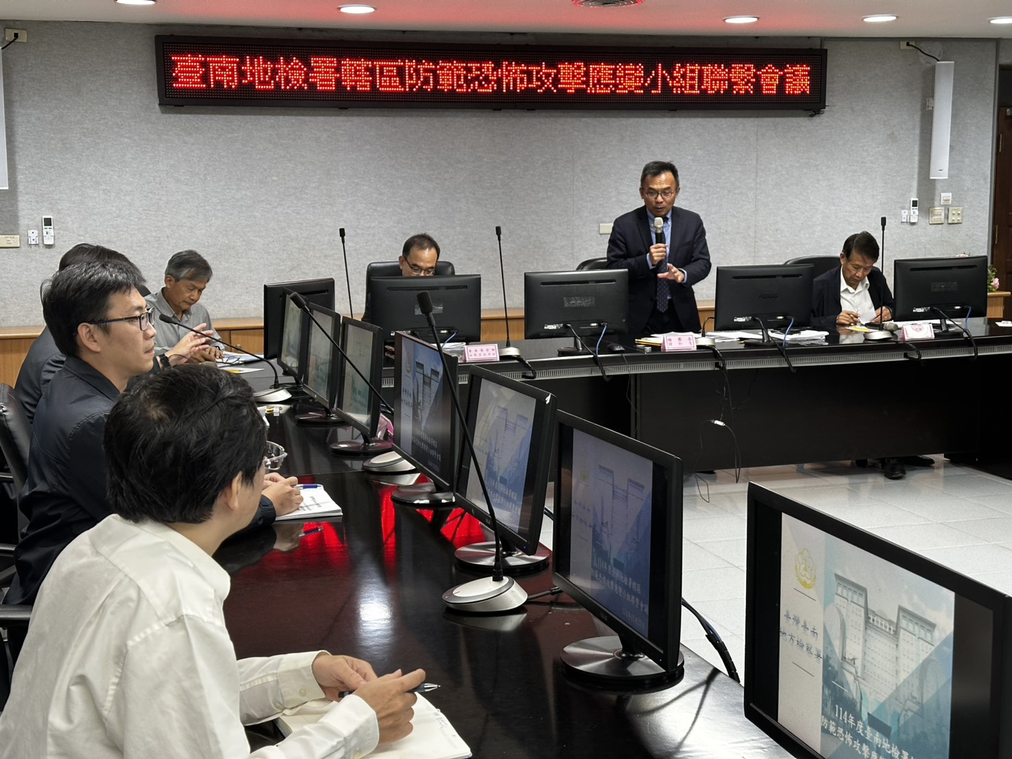 臺南地檢署鍾和憲檢察長於昨(23)日,於臺南地檢署第一會議室,召集轄內檢警調廉及政風等小組成員,親自主持防範恐怖攻擊應變小組聯繫會議,加強情資蒐報與風險評估之合作討論,藉以即時啟動應變與強制作為,藉以遏止恐嚇、模仿或散布恐懼情形的擴散。.jpg)