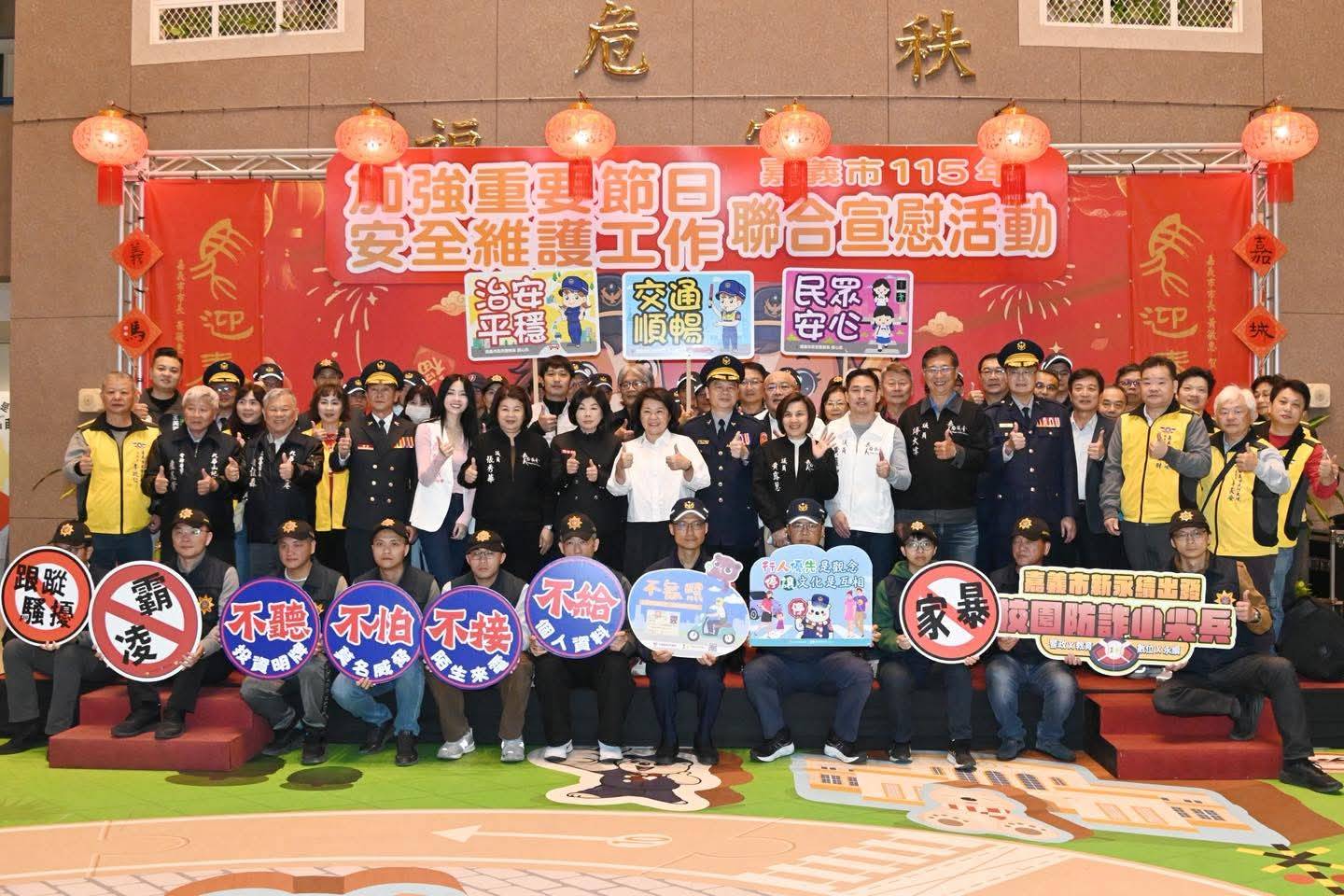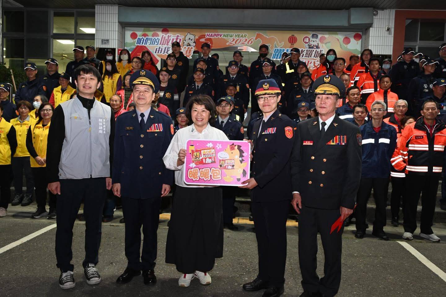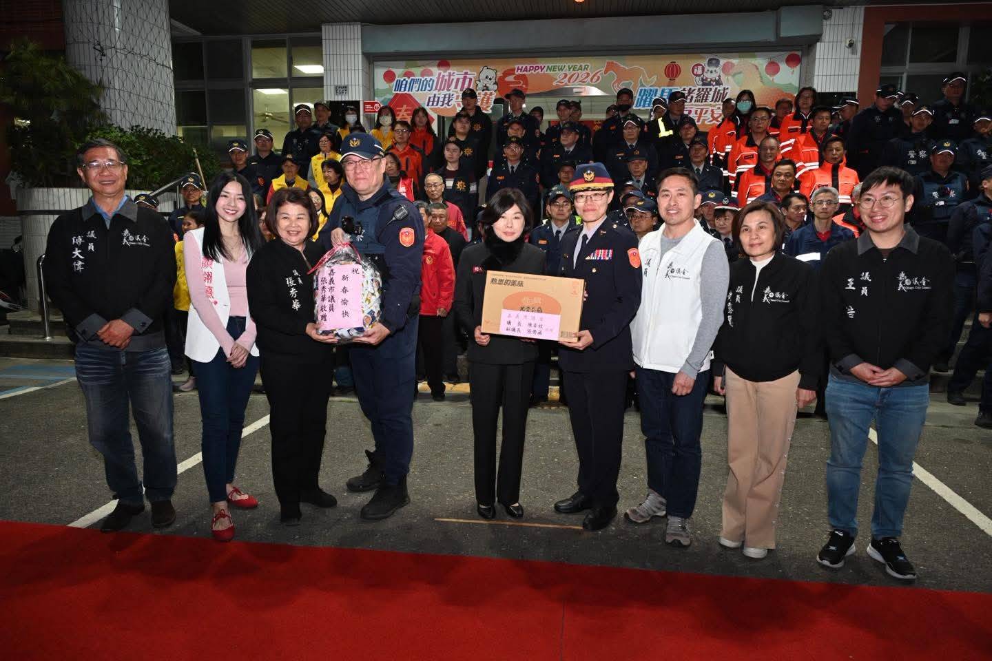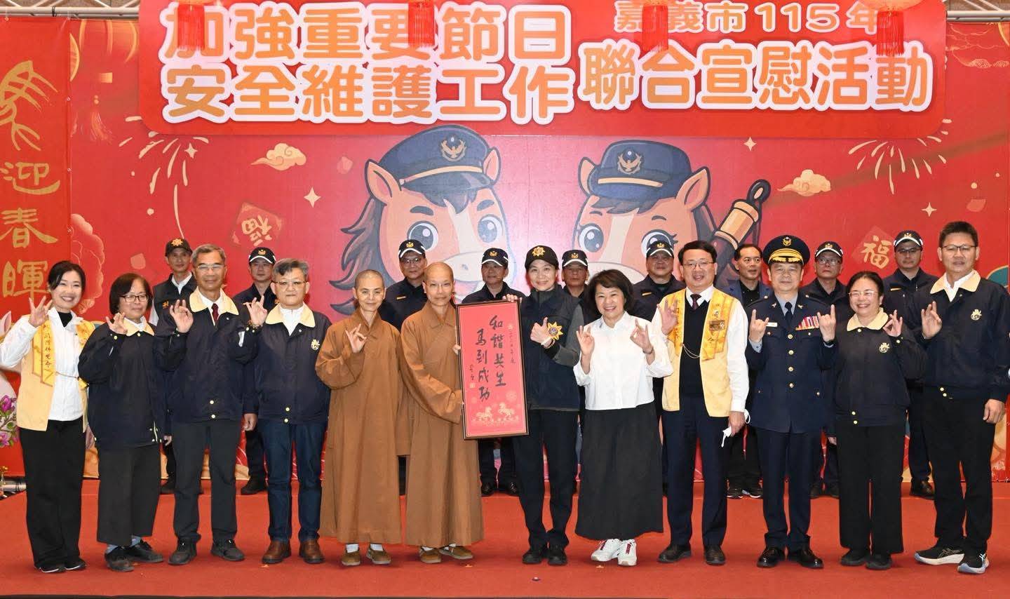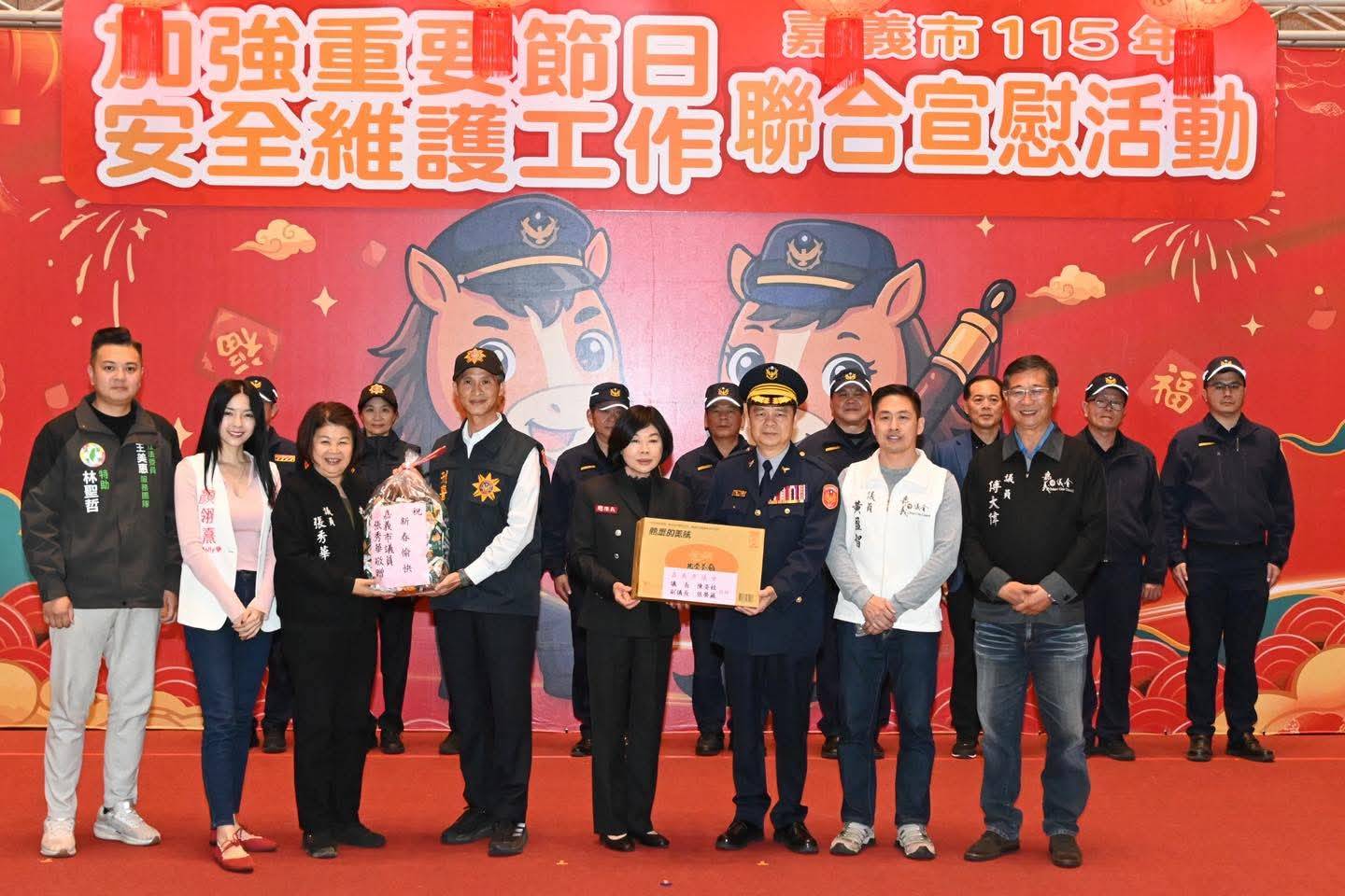 嘉義市長黃敏惠為慰勉115年加強重要節日安維工作執(協)勤人員,於2月9日晚上8時與市議會議長陳姿妏率同議員張秀華、黃露慧、傅大偉、黃盈智、王浩、顏翎熹、立法委員王美惠特助、警友會理事長陳建言、義警大隊長侯健一、民防大隊長李啟仁、志工大隊長黃國芳、