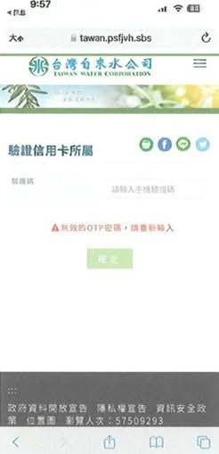 刑事局電偵大隊(第一隊)偵破詐騙集團以假冒「自來水公司」、「遠通電收」等機構名義,大量發送釣魚簡訊予不特定民眾,誘使被害人點擊連結並進入偽造官方網站,致使被害人誤信,進而輸入名下信用卡資料及驗證碼,隨即遭不詳人士於各大購物網站、百貨公司及銀樓等處進行盜刷。