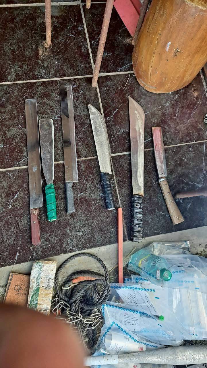 同時,起出查獲贓證物:查扣鎮暴槍、辣椒槍、棍棒、刀械、鐵鍊、第一級毒品海洛因針筒、第二級毒品安非他命、依托咪酯煙彈、依托咪酯粉末、原油、空彈殼、甘油、煙桿、注射器、現金贓款等贓證物。.jpg)