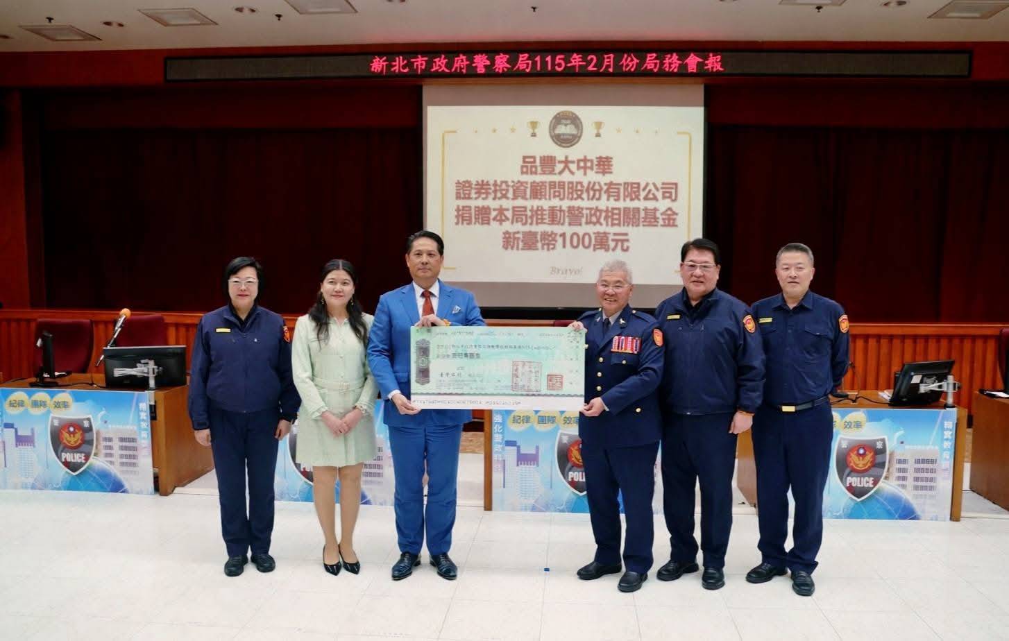 為展現企業社會責任,品豐大中華證券投資顧問股份有限公司於近日慷慨捐贈新臺幣100萬元予新北市政府警察局,專款用於推動警政相關基金。