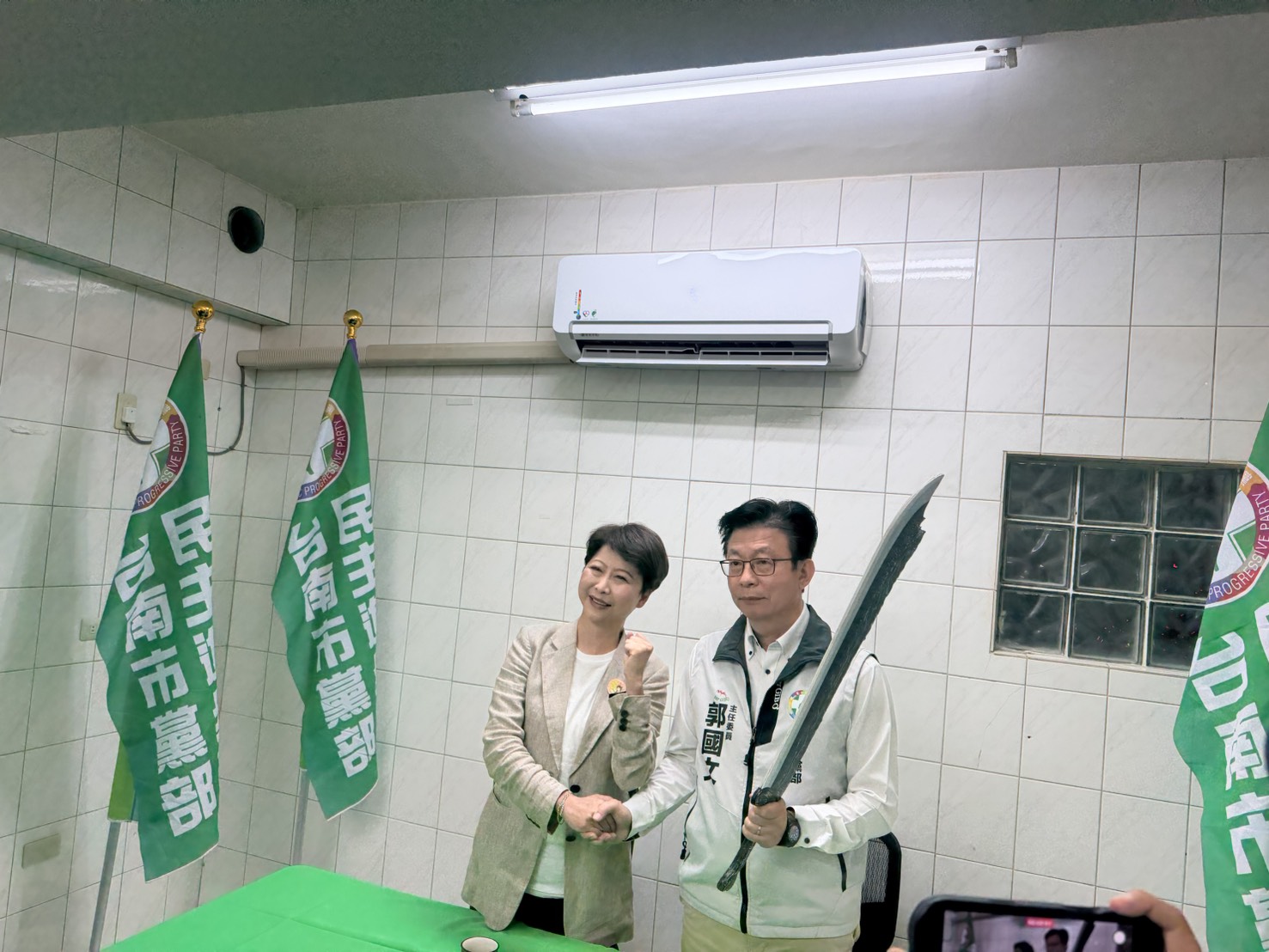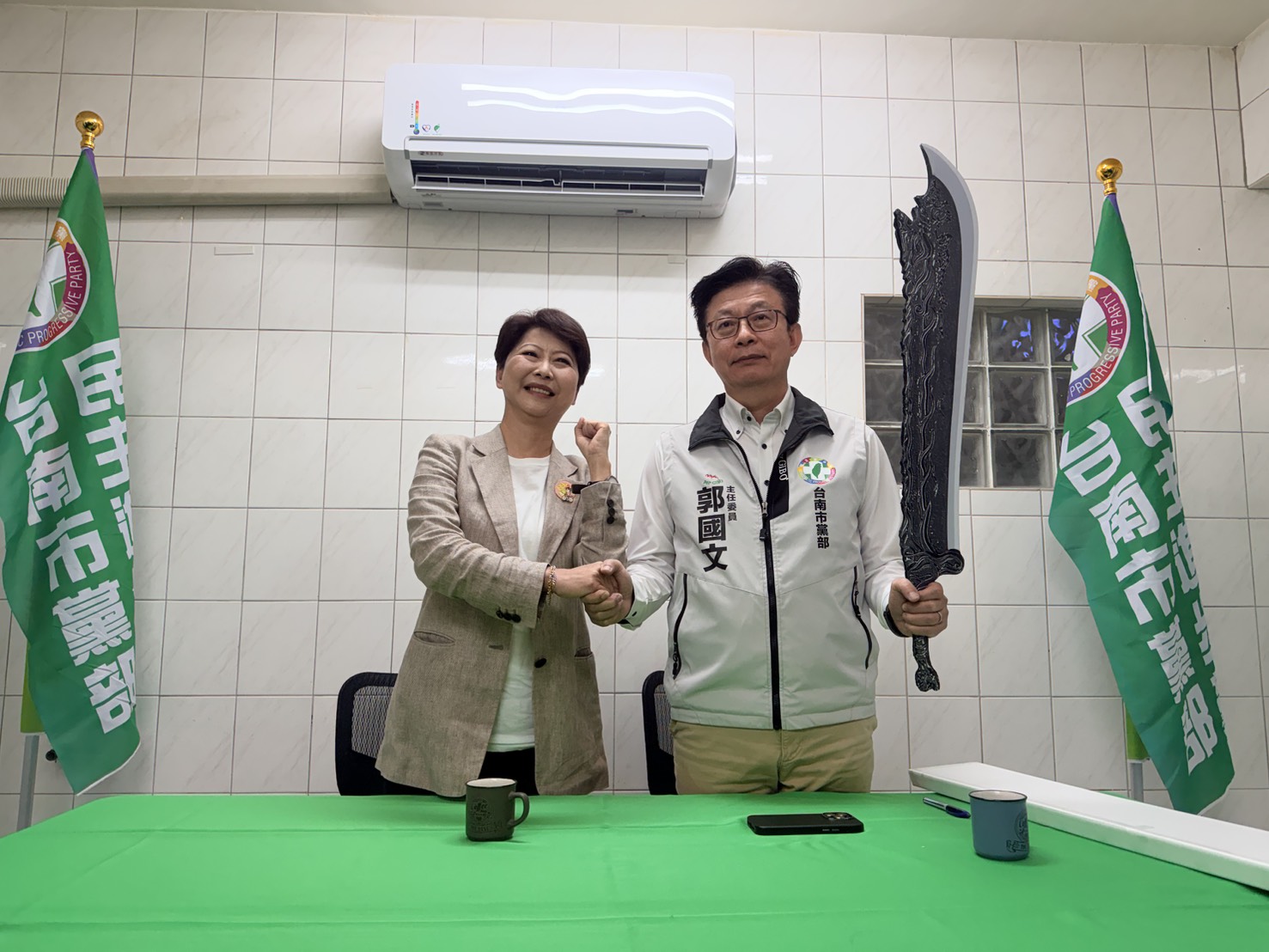 民進黨市長提名人陳亭妃拜會市黨部主委郭國文,郭國文持屠龍刀籲全力對抗國民黨。.jpg)