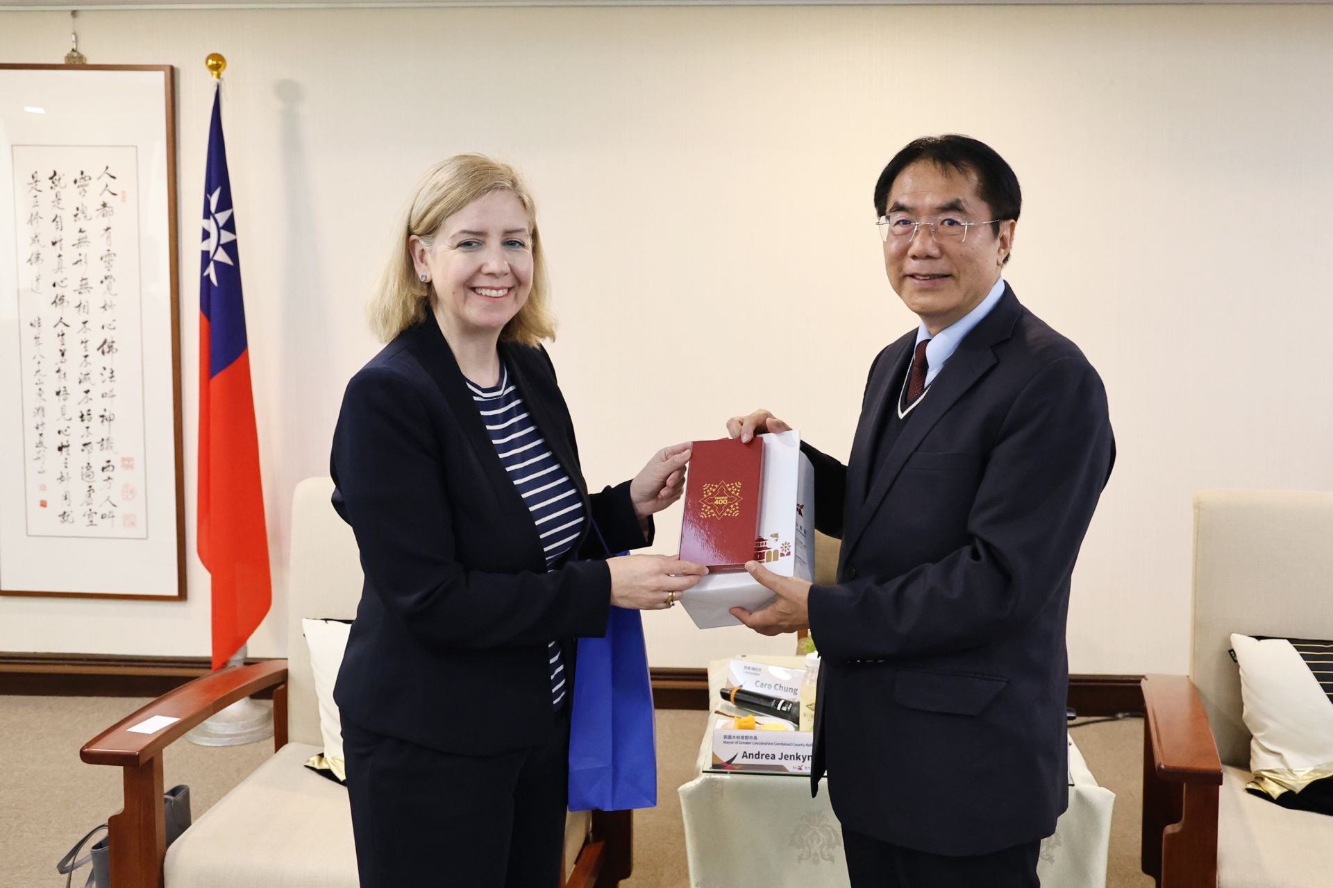 英國大林肯郡詹金斯(Andrea Jenkyns)市長今(19)日率農業、港務等相關領域代表一行7人蒞府拜會黃偉哲市長,由新聞及國際關係處蘇恩恩處長、農業局李芳林局長陪同接見,雙方就農業議題進行交流,現場互動熱絡。