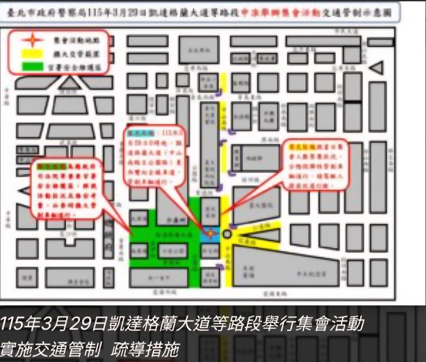 臺北市中正區凱達格蘭大道等路段於115年3月29日(星期日)0時至22時,申准舉辦「民眾黨集會」集會活動。為維護前揭活動交通秩序與安全,臺北市政府警察局業規劃交通疏導管制勤務,相關管制情形如下: