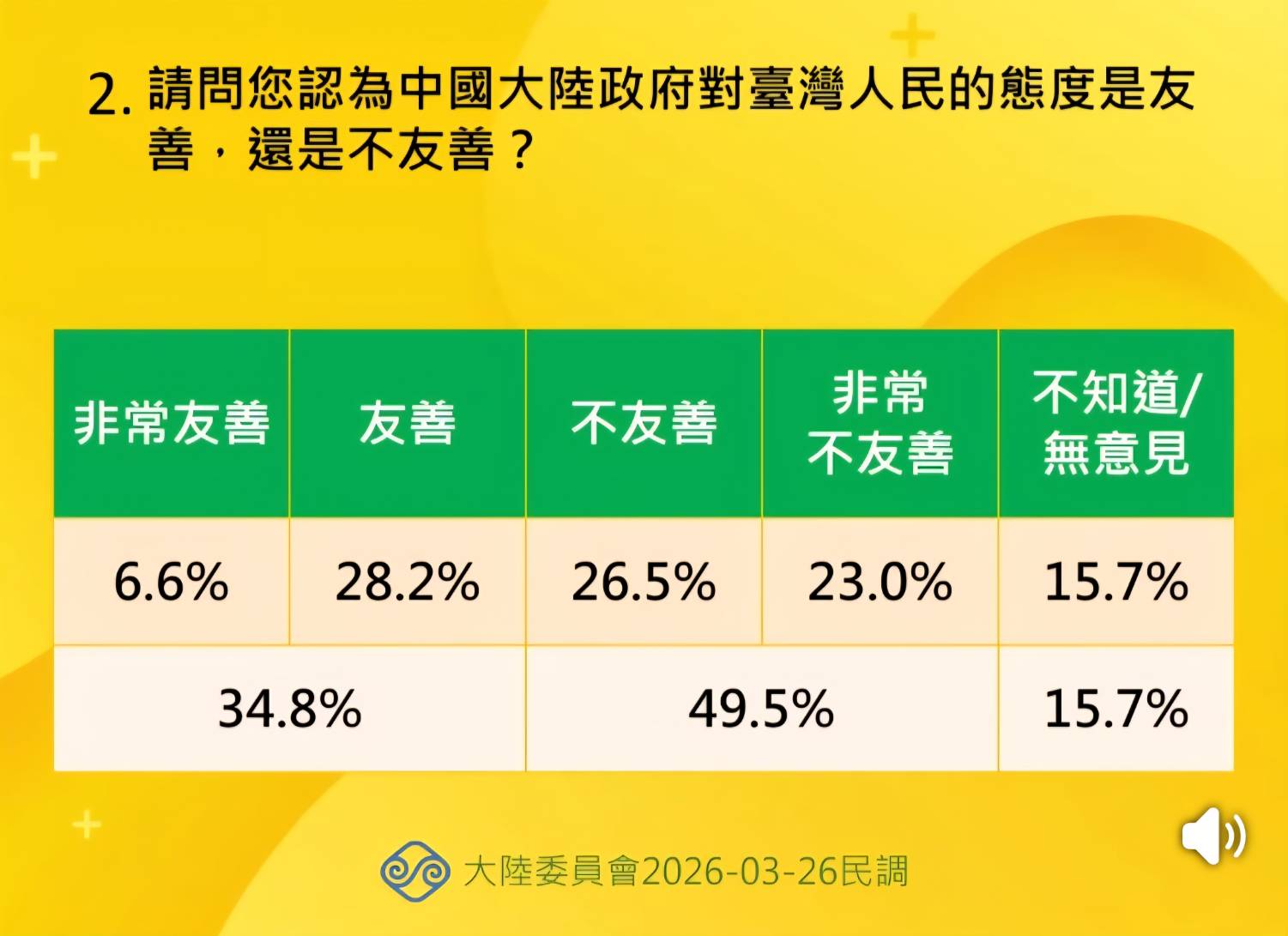 本項調查是陸委會委託國立政治大學選舉研究中心,在115年3月19日至23日以電話訪問台灣20歲以上成年民眾,有效樣本1,138份,信賴度為95%,抽樣誤差在±2.91%。
