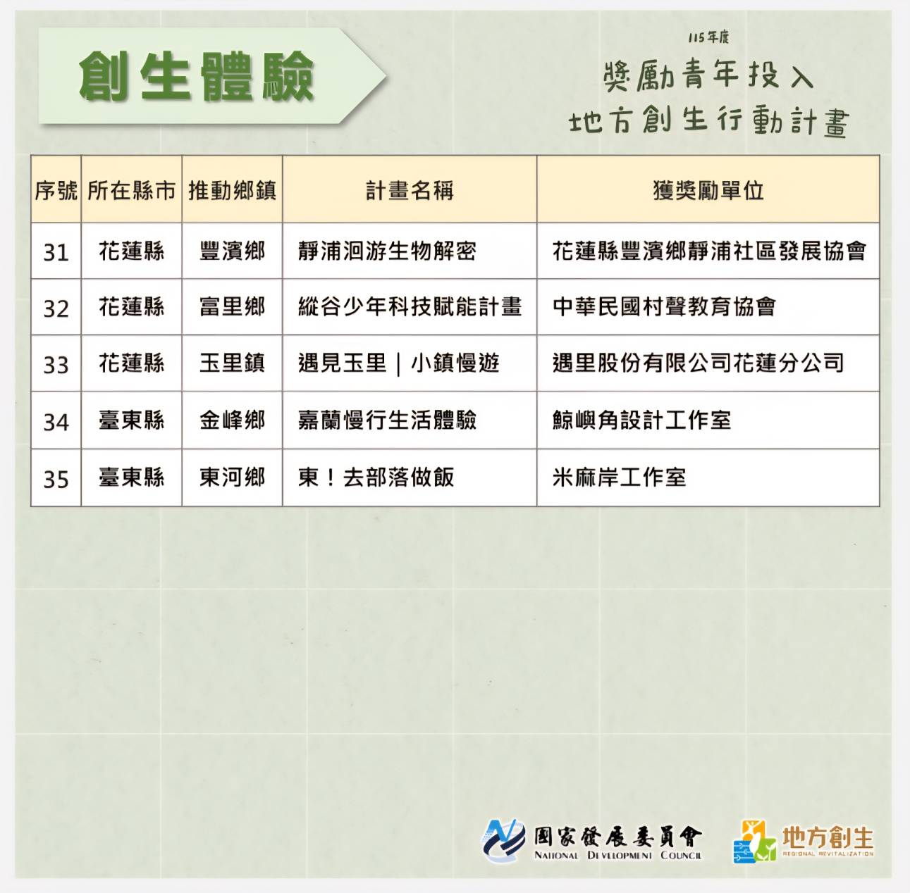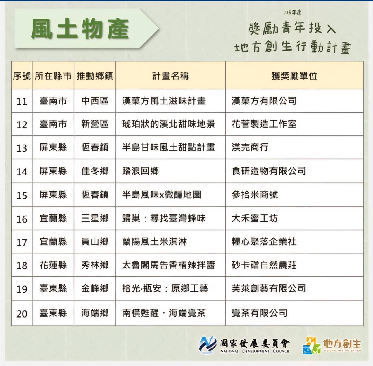 115年度獎勵青年投入地方創生行動計畫,最終決審核定名單出爐。