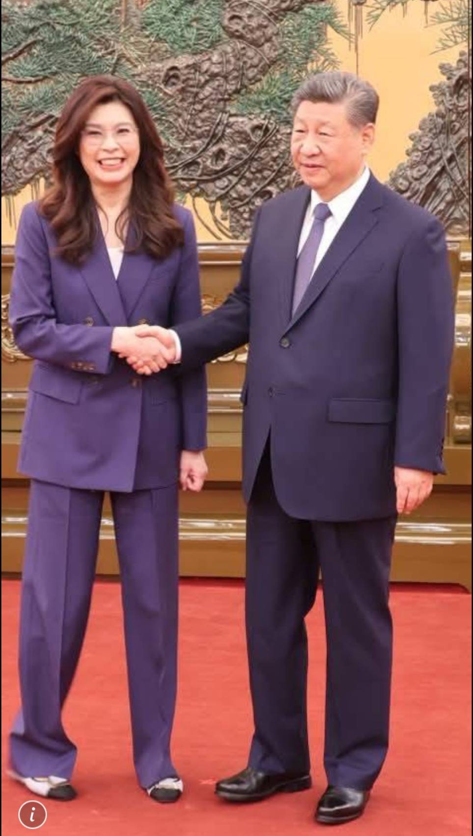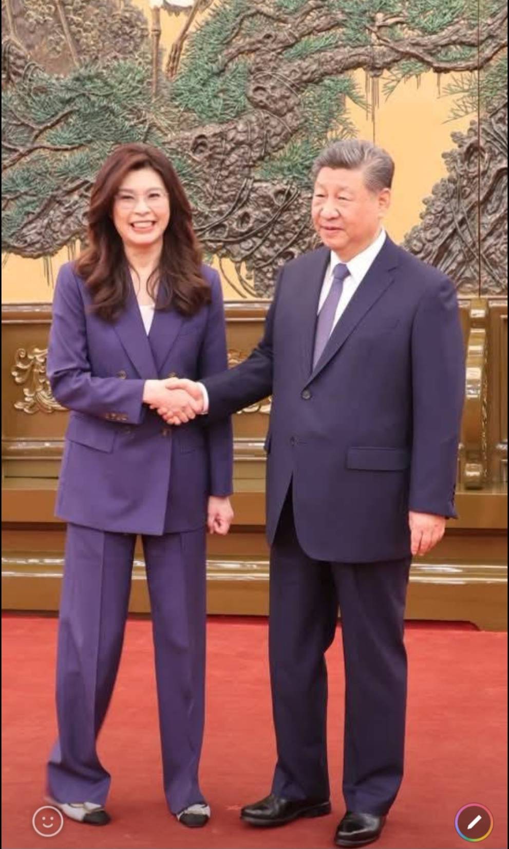 面對記者詢問首次會見中共總書記習近平及午宴互動細節,中國國民黨主席鄭麗文輕鬆表示,午宴氣氛十分溫馨,令中國國民黨主席鄭麗文印象深刻的不僅是第一道菜、特別介紹為當年宴請尼克森總統國宴同款的福建海蚌,中共總書記習近平也相當貼心,關心訪問團此行適應情況,並請她代為向前主席連戰、馬英九致意問好,還談及馬習會等過往細節,讓整個交流過程顯得親切融洽。