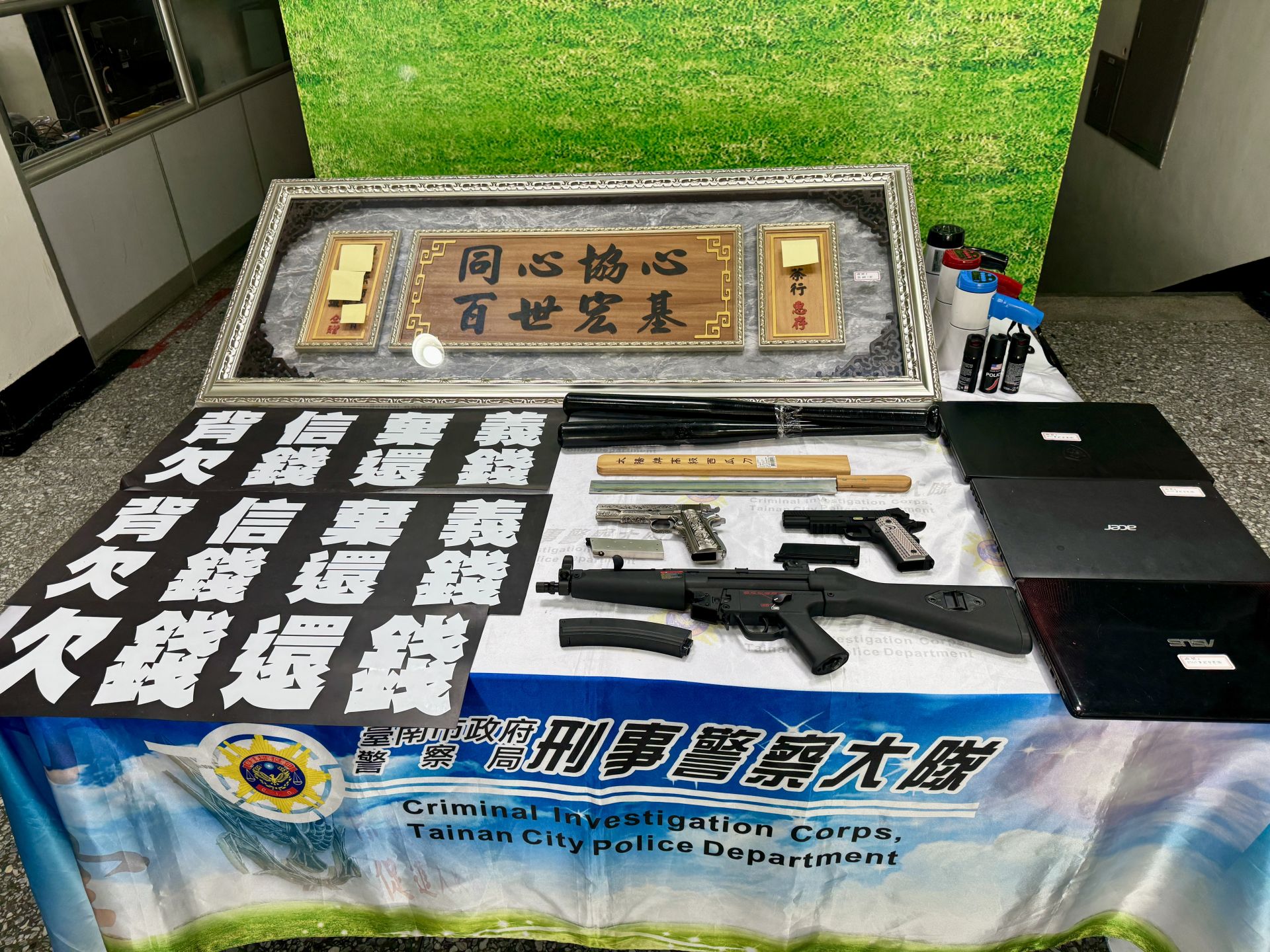 案經報請臺南地檢署檢察官蘇聖涵指揮,由臺南市刑大、學甲分局、佳里分局、新營分局及刑事警察局南部打擊犯罪中心等單位共組專案小組,兵分十路拘獲鐘姓主嫌與成員共計12人到案,起獲鋁棒、西瓜刀、辣椒水、空氣槍、仿MP5電動氣槍、○○茶行匾額、筆記型電腦、「欠錢還錢」磁性軟板、大聲公等證物;全案調查後,依違反組織犯罪防制條例、刑法強制罪、恐嚇取財罪及公司法等罪嫌,移請臺南地檢署偵辦,並對鐘姓主嫌聲請羈押。.jpg)