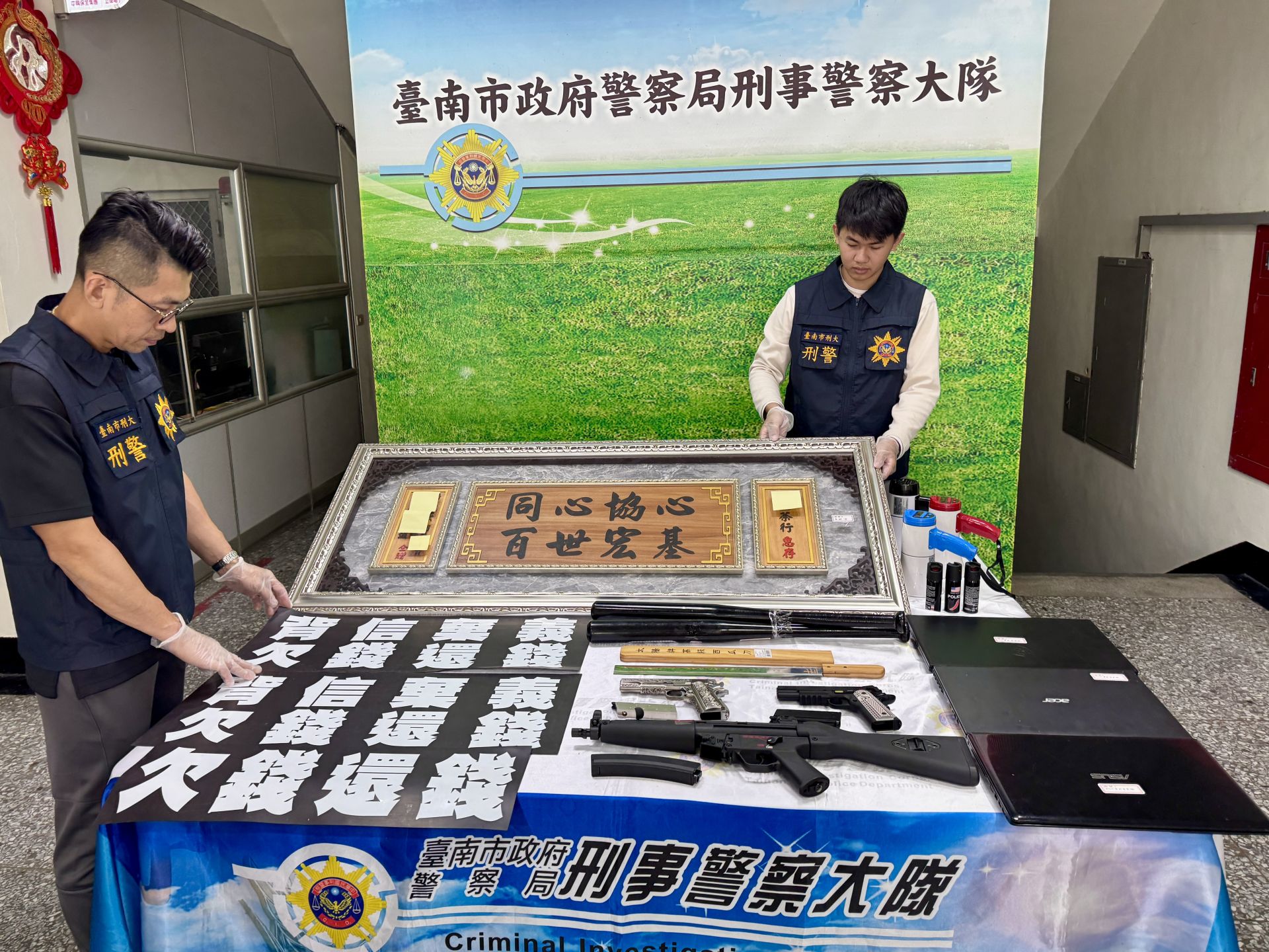 案經報請臺南地檢署檢察官蘇聖涵指揮,由臺南市刑大、學甲分局、佳里分局、新營分局及刑事警察局南部打擊犯罪中心等單位共組專案小組,兵分十路拘獲鐘姓主嫌與成員共計12人到案,起獲鋁棒、西瓜刀、辣椒水、空氣槍、仿MP5電動氣槍、○○茶行匾額、筆記型電腦、「欠錢還錢」磁性軟板、大聲公等證物;全案調查後,依違反組織犯罪防制條例、刑法強制罪、恐嚇取財罪及公司法等罪嫌,移請臺南地檢署偵辦,並對鐘姓主嫌聲請羈押。.png)