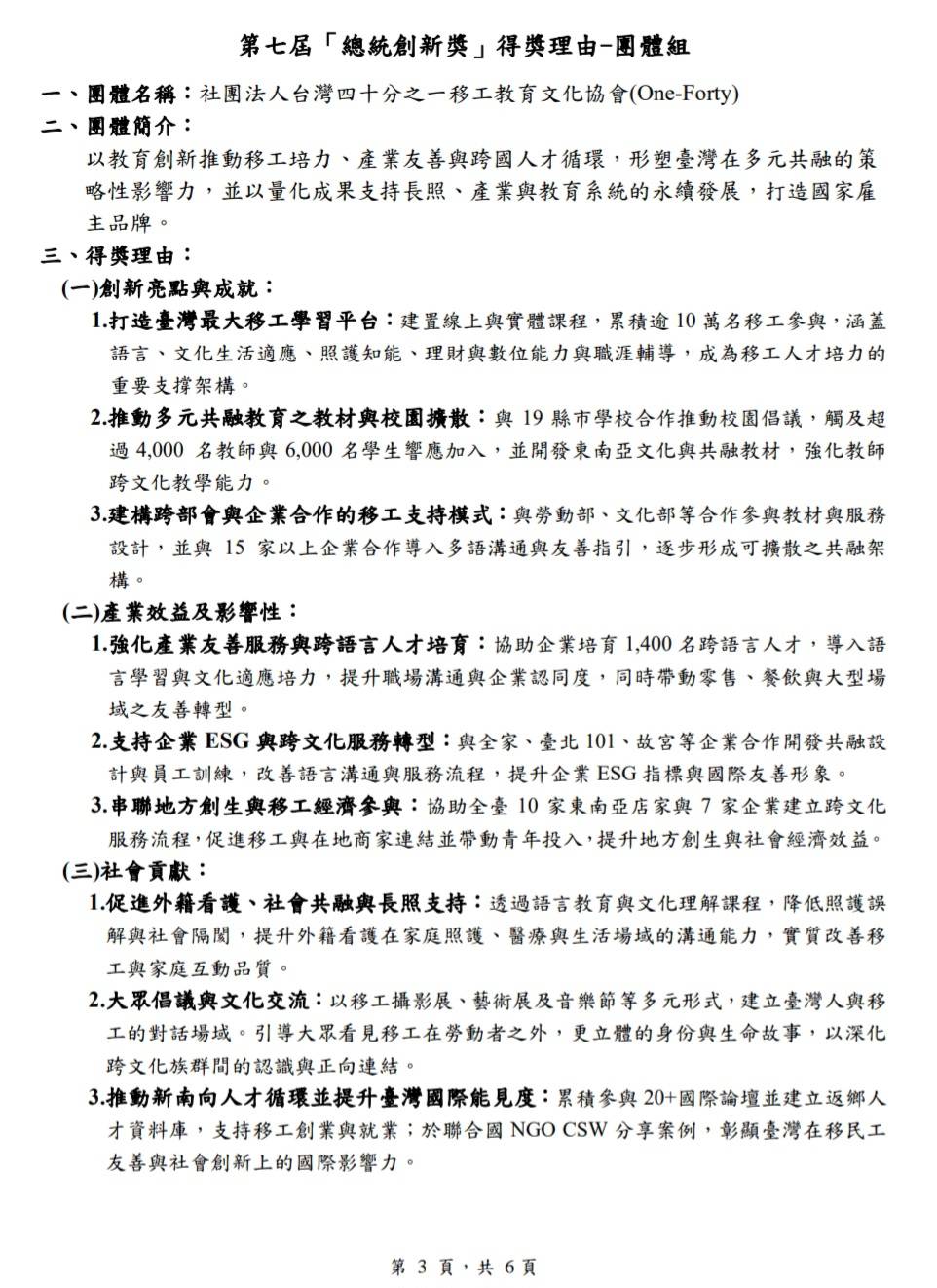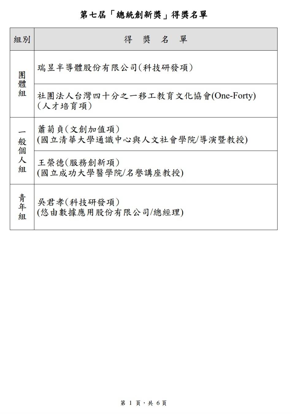 總統府今(14)日公布第七屆「總統創新獎」得獎名單。