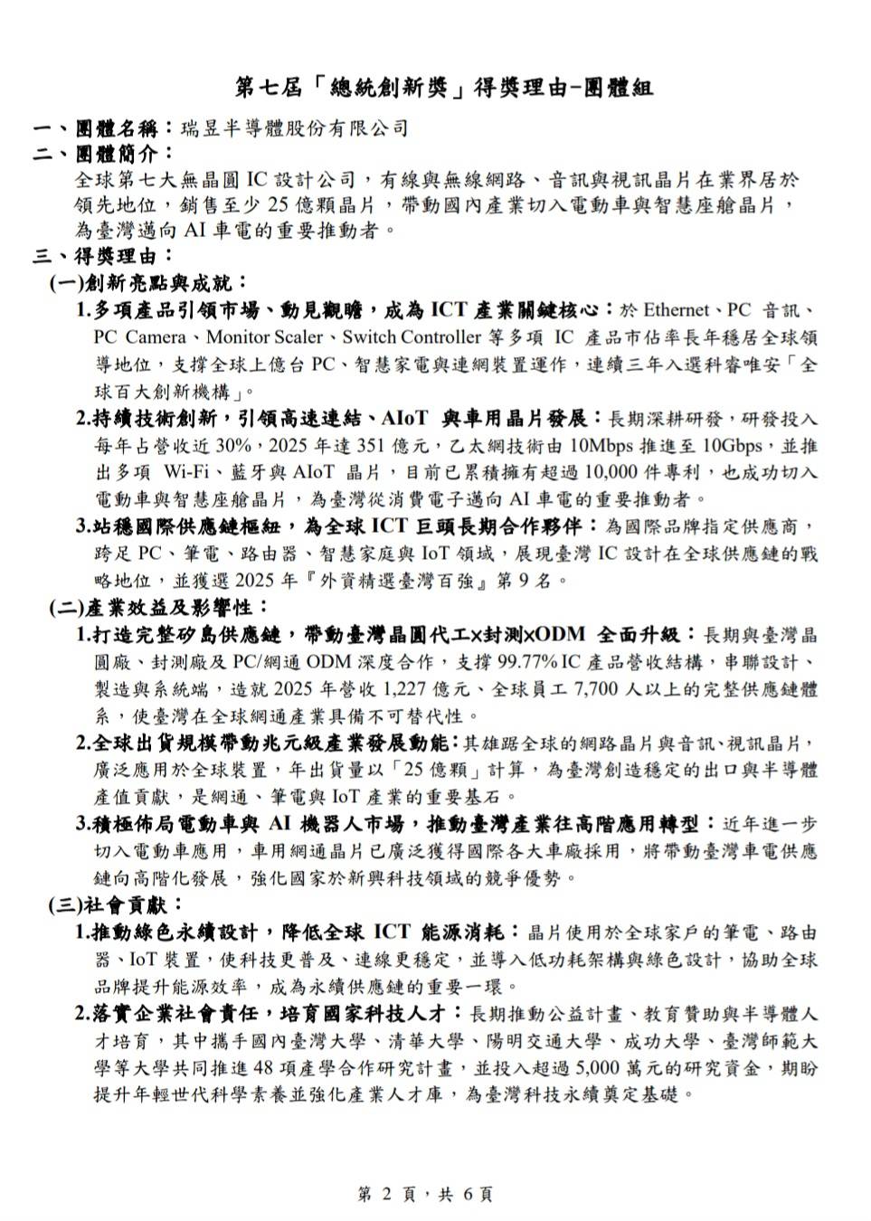 「總統創新獎」由經濟部主辦,中央研究院、國家發展委員會、國家科學及技術委員會、教育部、文化部等各部會共同協辦與推動,期盼促進多元、整合、跨領域等綜合發展,讓創新思維向社會擴散,能更加普及與多元化。第七屆「總統創新獎」頒獎典禮預定於115年4月28日於總統府舉行,由總統親自頒獎表揚。