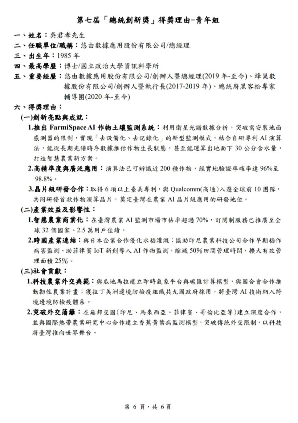 青年組得獎者為「悠由數據應用股份有限公司」吳君孝總經理。