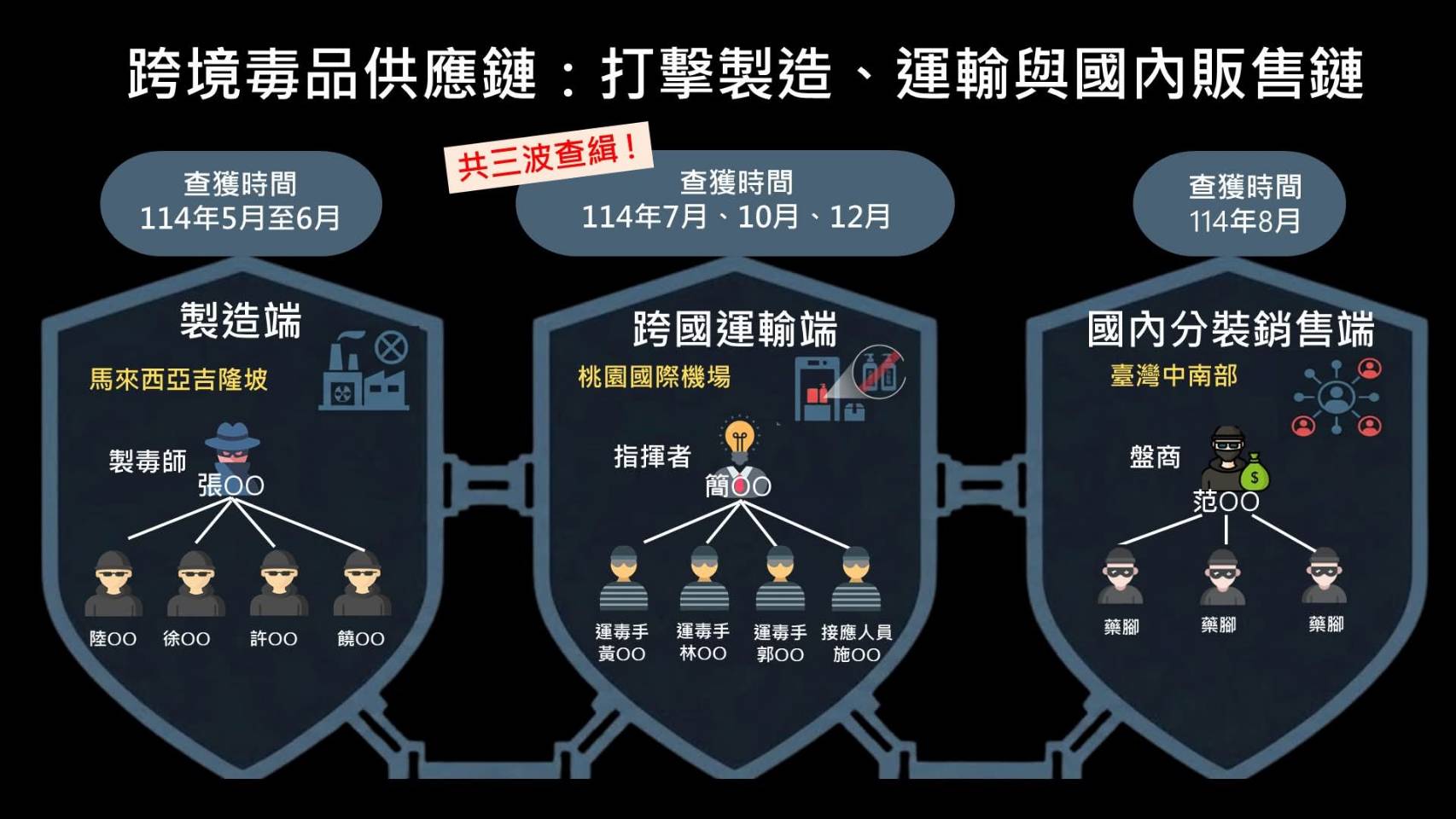 臺灣桃園地方檢察署、臺灣雲林地方檢察署、財政部關務署臺北關、刑事警察局國際刑警科、駐馬來西亞聯絡組、新北市政府警察局永和分局、雲林縣警察局刑事警察大隊、臺北市政府警察局刑事警察大隊肅竊組,以及馬來西亞皇家肅毒局,於114年5月28日至114年12月22日,在馬來西亞吉隆坡、臺灣桃園市,查獲嫌犯:(一)馬來西亞毒品工廠:臺籍犯嫌張○○(製毒師)、陸○○、徐○○、許○○、饒○○等5人。