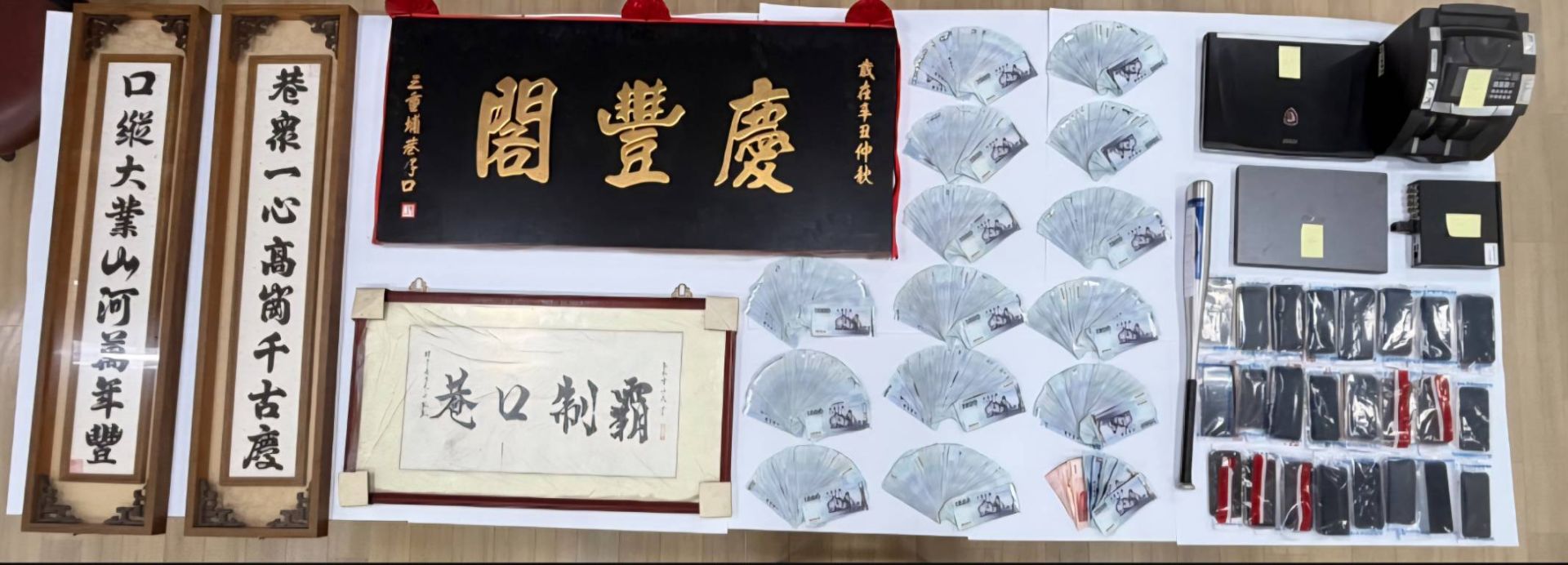 同時,起出查獲贓證物:現金新臺幣(以下同)143萬400元、牌匾4面、點鈔機1台、球棒1支、K盤3組、K他命1包、大麻花1包、安非他命1包、監視器主機1組、筆電2臺、存摺2本、金融卡4張、手機24支等證物。.jpg)