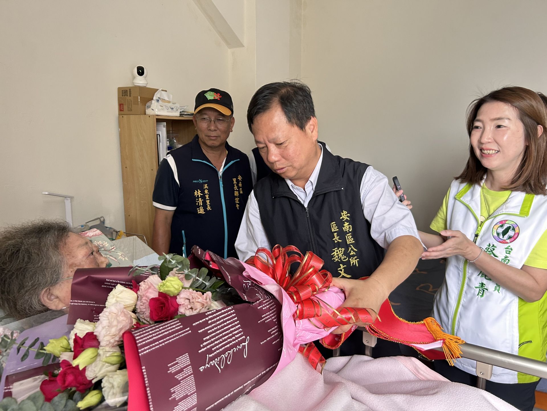 原訂於5月4日於市府由市長公開表揚,因蘇邱桂美女士行動不便,安南區公所於4月29日上午由區長魏文貴特別代表市長黃偉哲,會同前台南市議會議長郭信良 市議員蔡麗青、黃肇輝、陳怡珍 黃麗招 李中岑 朱正軒,以及立法委員陳亭妃、林俊憲服務團隊與安富里長翁健倫 溪東里長林清遙等地方里長,親赴府上張貼紅榜致賀,向這位用一生奉獻家庭與社會的母親致上最高敬意。(1).jpg)