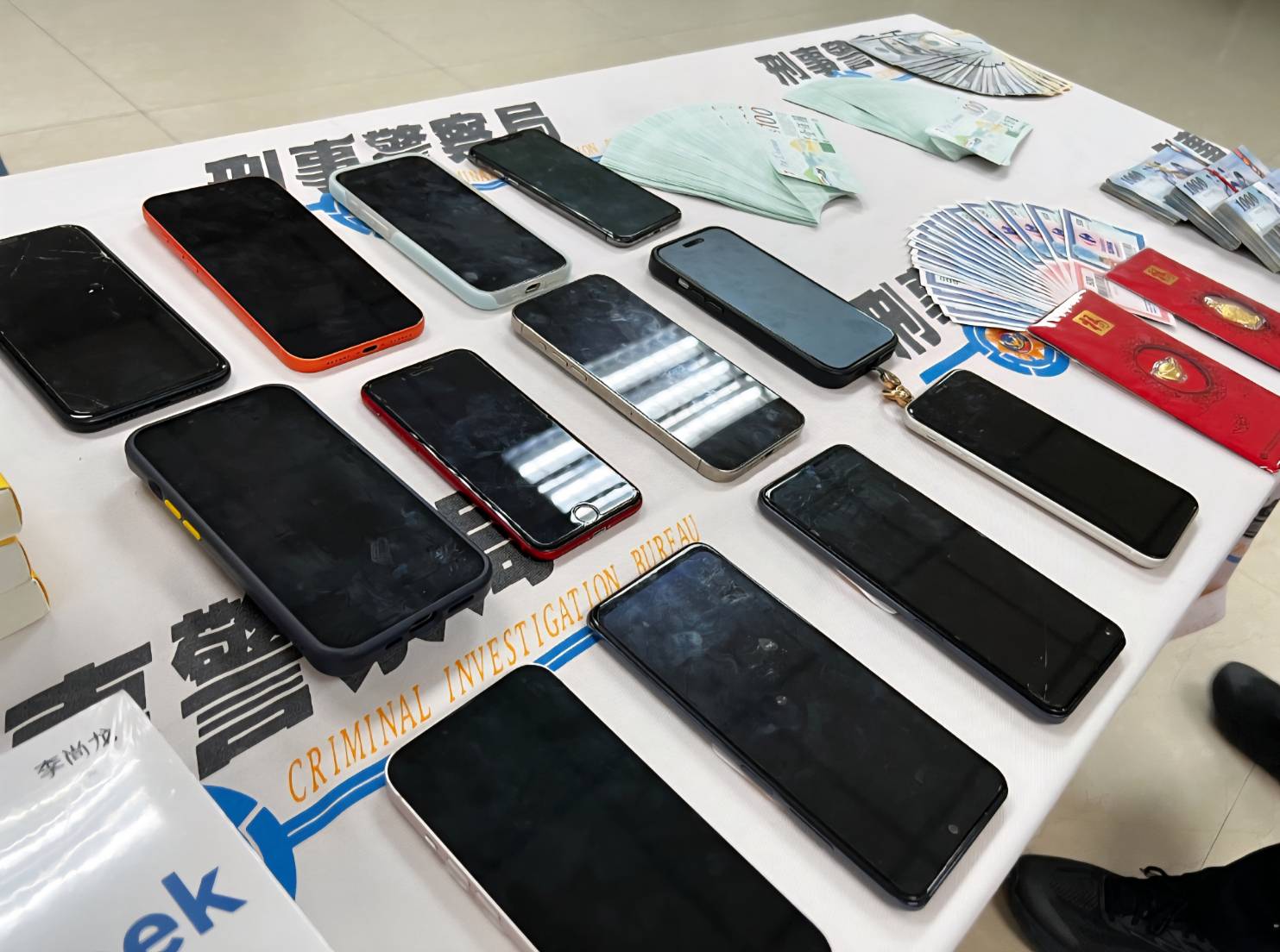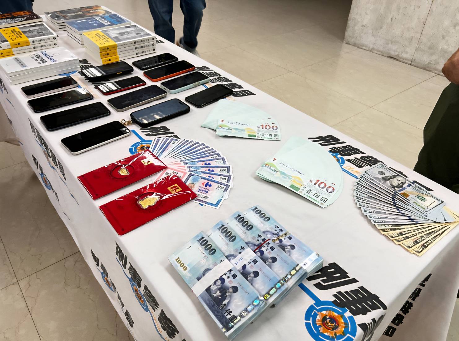 同時,起出查獲贓證物:現金新臺幣(下同)36萬8,000元、統一超商佰元禮券176張、家樂福伍佰元商品提貨券30張、美金1,590元、黃金紅包袋2個、與詐欺機房配合之郵局寄件收據、運費明細、書本33本、手機19支等贓證物。.jpg)