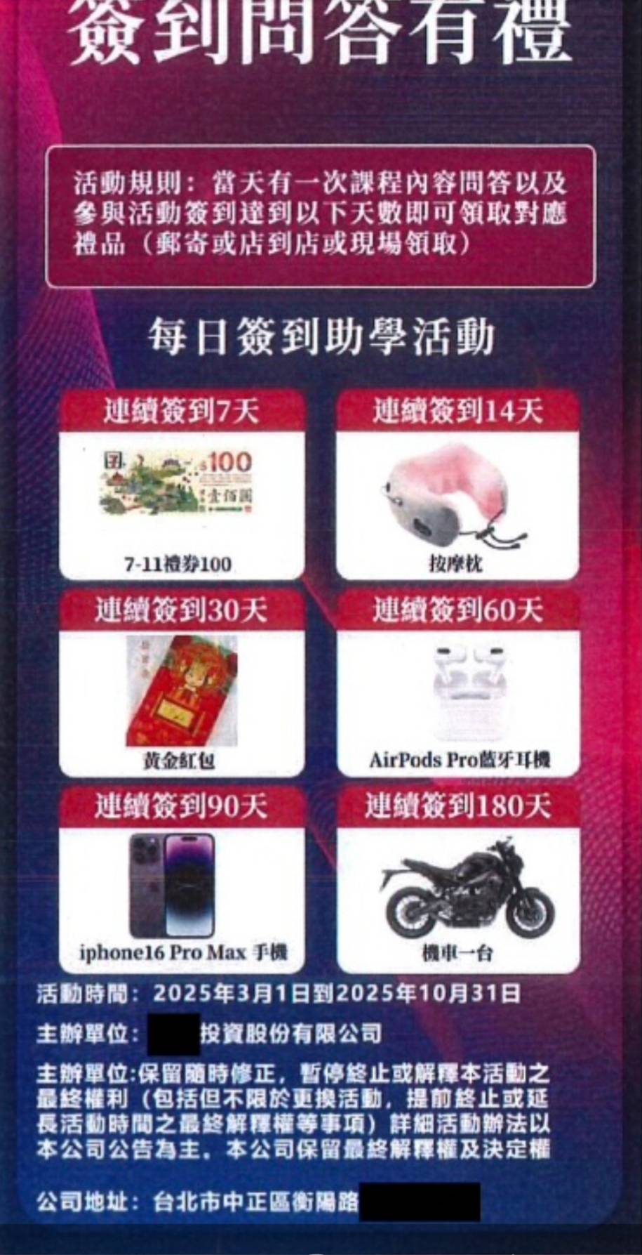 刑事局偵四大隊(第三隊)偵破張姓犯嫌為首之詐騙集團,與境外詐欺機房配合,以假投資手法誆騙被害人投入資金,並以累計登入天數抽好禮為噱頭吸引被害人,當被害民眾累積登入天數欲兌換禮品時,張嫌即與境外機房配合,指示旗下成員將指定之禮品寄出,甚至為取信被害人,張嫌另租用高級商辦大樓,設立假投資公司,讓被害人親自到訪後誤信為投資公司辦公室,詐騙集團設下重重圈套,最後待被害人投入大量資金,未能拿回報酬,才驚覺受騙。.jpg)
