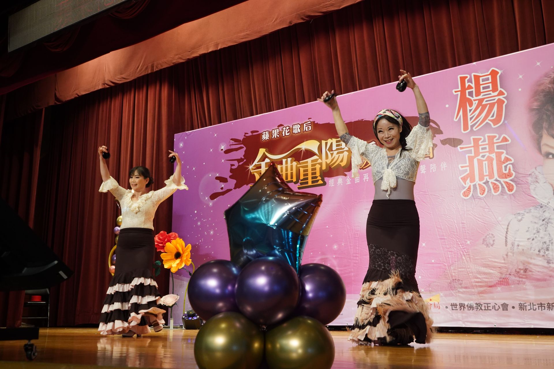 世界佛教正心會與新北市政府社會局及新北市新聞記者職業工會攜手舉辦「重陽敬老公益演唱會」,於今(7日)邀請旅居美國紐約國寶級「蘋果花歌后」楊燕演唱經典歌曲,楊燕女士用甜美溫暖的歌聲演出一首首膾炙人口的歌曲,現場長者齊聲唱和,用最熱烈的掌聲圓滿這場公益演唱會。