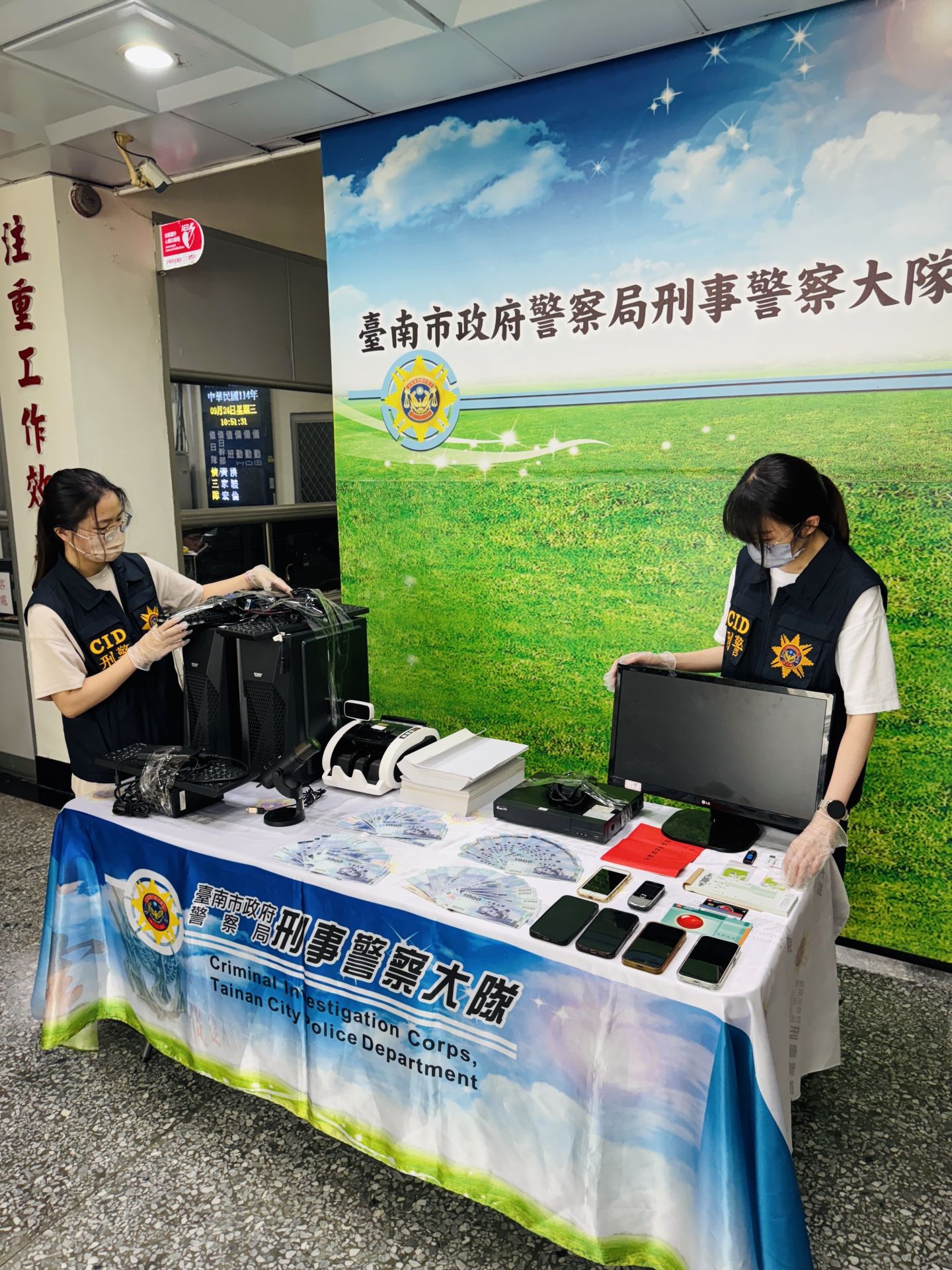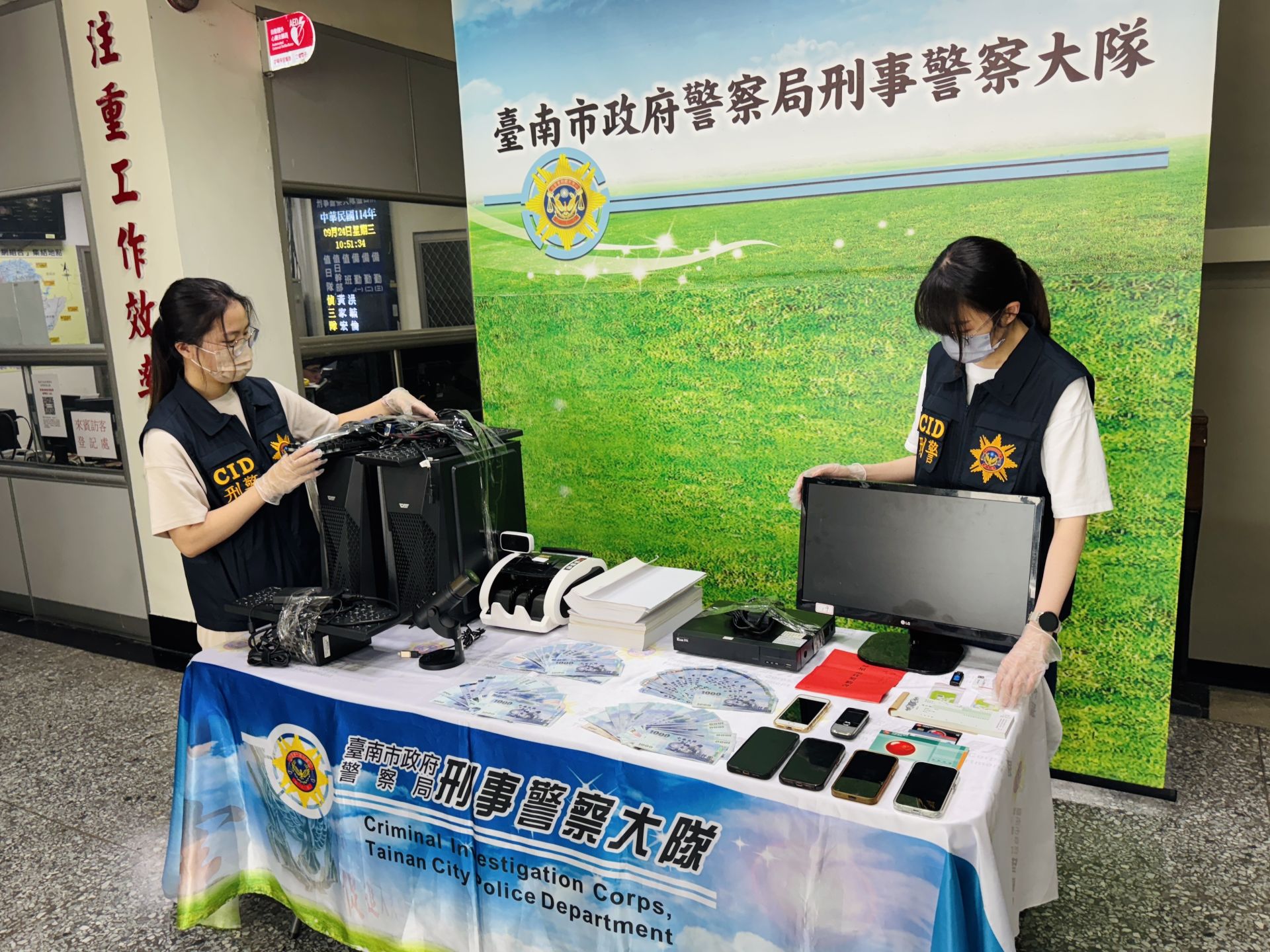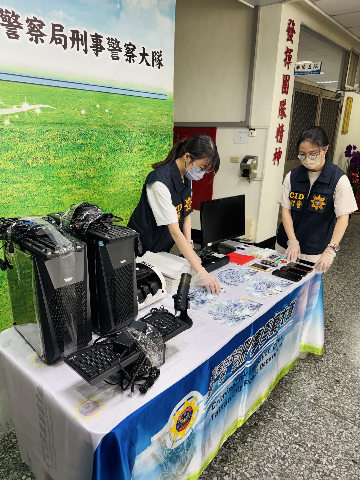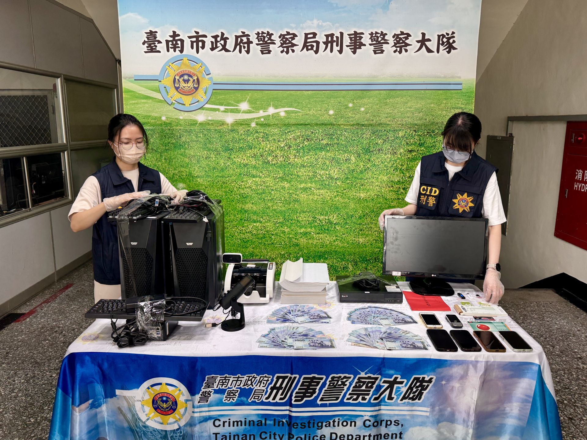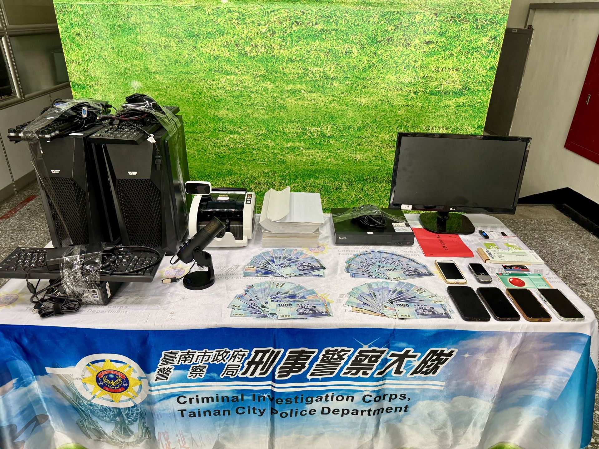 共計起獲電腦主機組8組、點鈔機1臺、監視器主機2組、現金新臺幣7萬5,000元、隨身碟3支、第二級毒品梅錠103顆、手機5支及相關犯罪工具,全案依涉犯刑法詐欺、偽造文書、洗錢防制法、組織犯罪防制條例及個資法等罪嫌,移送嘉義地檢署偵辦。