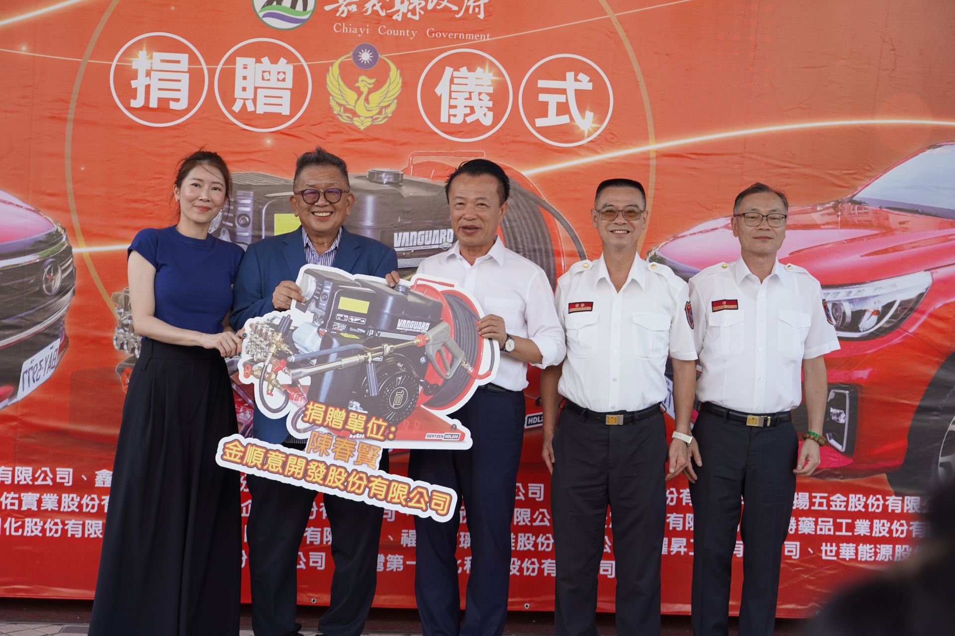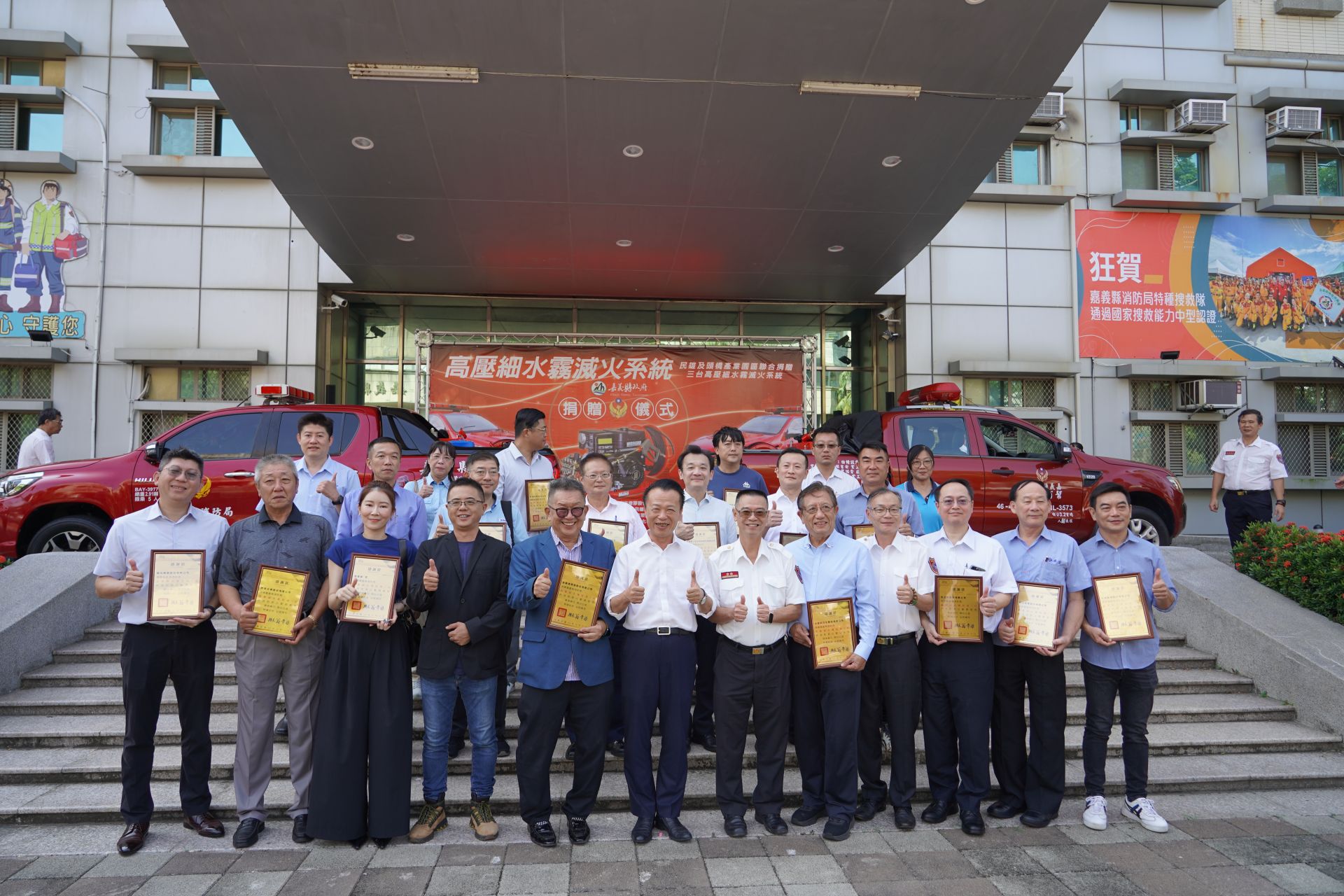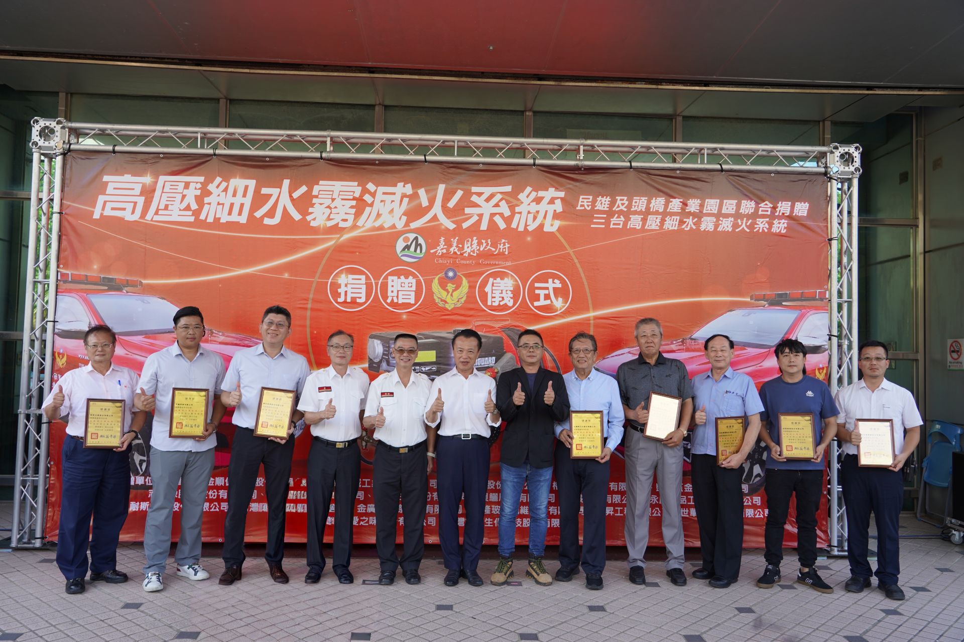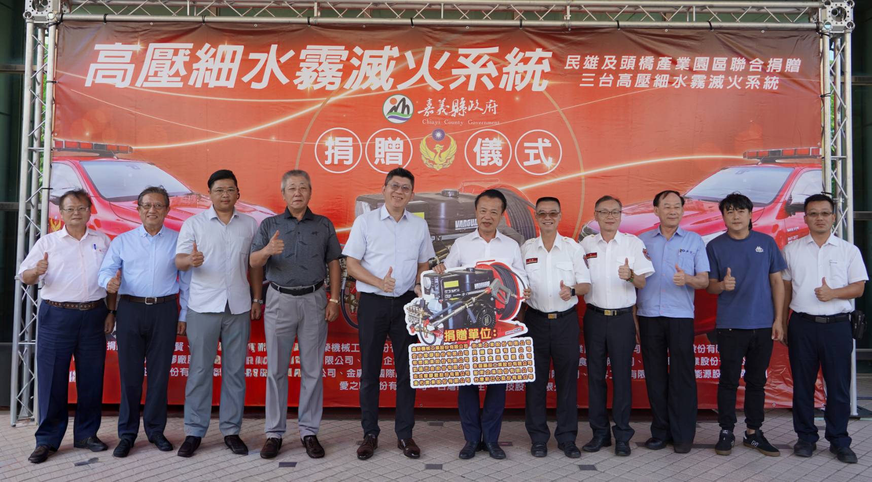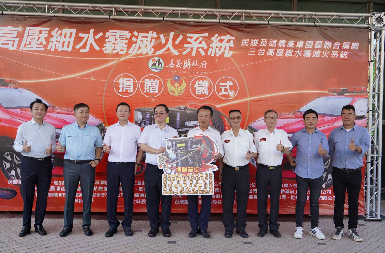 民雄及頭橋產業園區等20家廠商聯合捐贈嘉義縣消防局3台高壓細水霧滅火系統設備總價新臺幣190萬元整,由嘉義縣縣長翁章梁代表接受並頒贈感謝獎狀,由衷感謝在地成功人士及企業造福社會的慈善義舉。