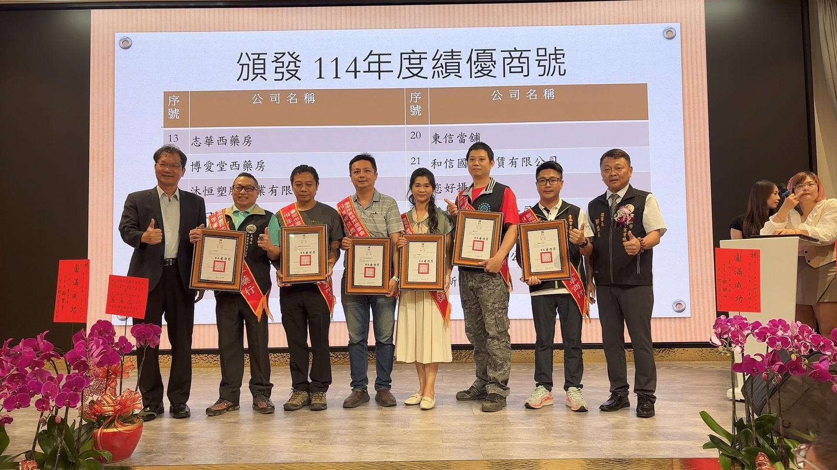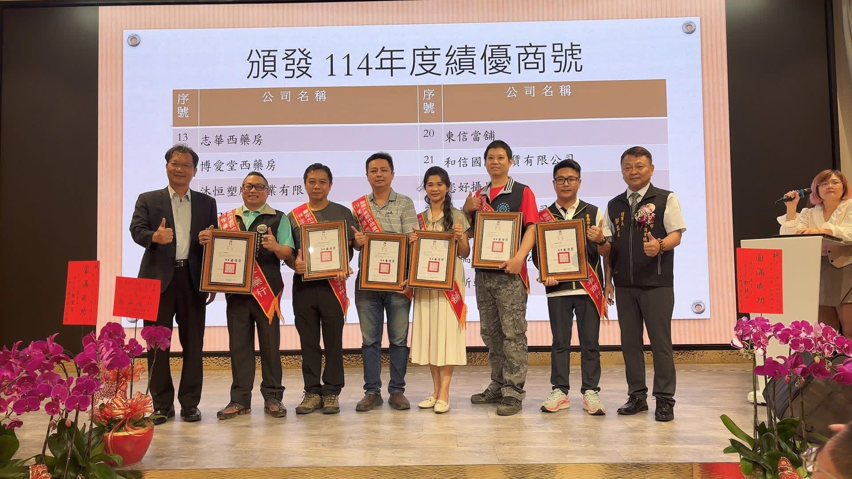 114年度績優商號名單,包括:南科當舖、玖郁土木包工業、慶豐農業資材行、南科贊美酒店有限公司、萬味麵包店、昇億銀樓、唐明商行、大榮蔘藥行、奇蹟美容美髮事業有限公司、順弘冷凍空調有限公司、鑫福樂汽車商行、福興工作所、志華西藥房、博愛堂西藥房、沐恒塑膠工業有限公司、好口味食品廠、豐裕碾米工廠、宇捷清潔有限公司、阿棋禮儀社、東信當舖、和信國際租賃有限公司、您好攝影、華根企業有限公司、東建工程股份有限公司、桔瑞國際有限公司、立新乾洗商店等26家。