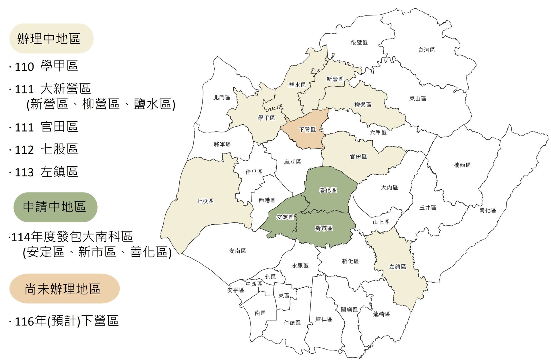 因應114年1月20日公告國土計畫法延後(最長6年後)公告實施國土功能分區圖,在區域計畫法與國土計畫法間過渡時期,內政部國土管理署提出新的鄉村地區計畫之推動政策,市府辦理學甲、大新營地區(新營、鹽水、柳營)及官田區皆已完成研究規劃,後續將透過法定審議程序,將空間規劃落實至法定計畫中,至於七股區、左鎮區及即將執行大南科地區(安定、新市、善化)也持續推動,並預計116年爭取辦理下營區鄉村地區整體規劃。