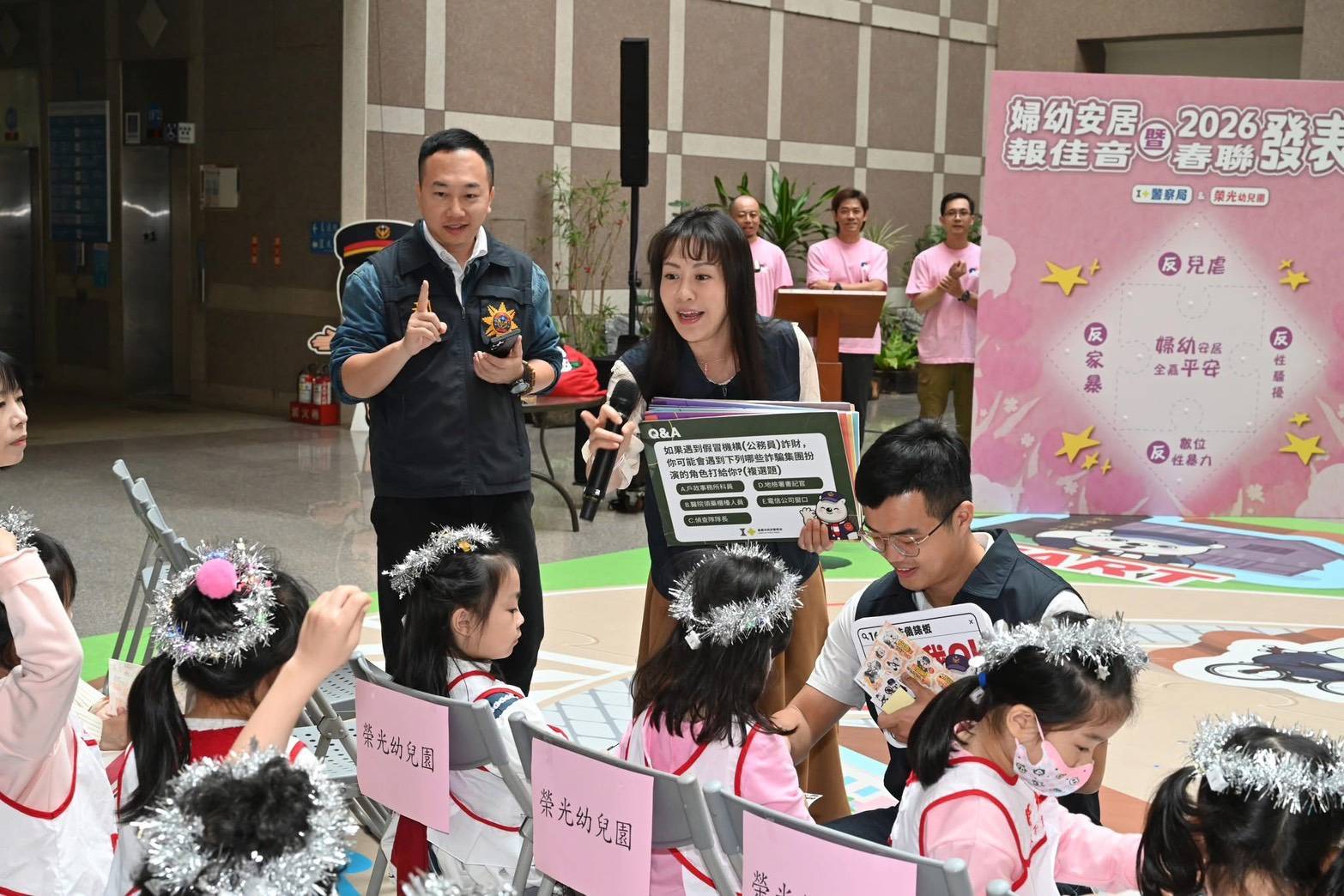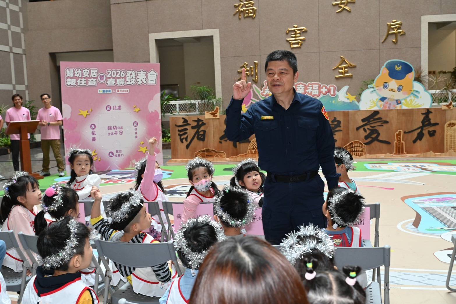 活動除透過榮光幼兒園孩子們純真的歌聲,傳遞平安與關愛外;警察局特別發表的2026「平安」春聯,正代表著嘉義市政府警察局整個團隊展望2026年的期許-警察守護嘉園、守護社區、守護婦幼、守護每一個家庭的用心與承諾。