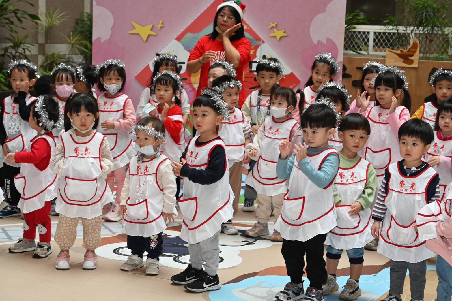 活動現場,小朋友戴著聖誕帽、唱著報佳音歌曲,也象徵社區共同守護孩子、守護家庭的溫暖力量。