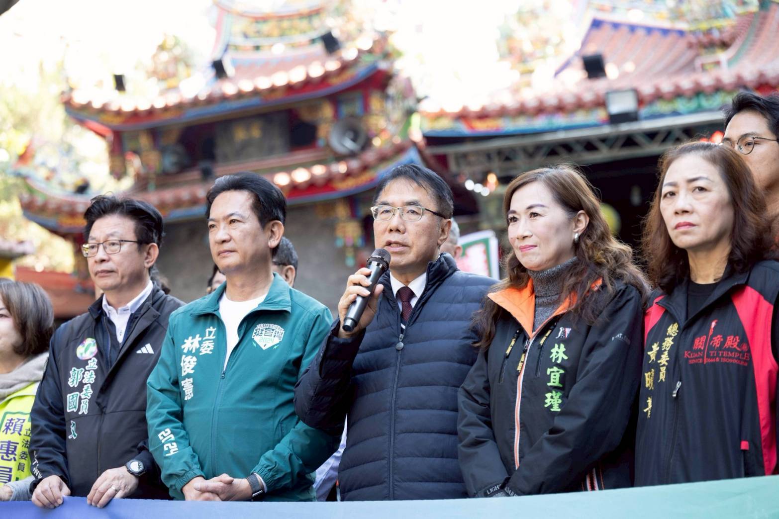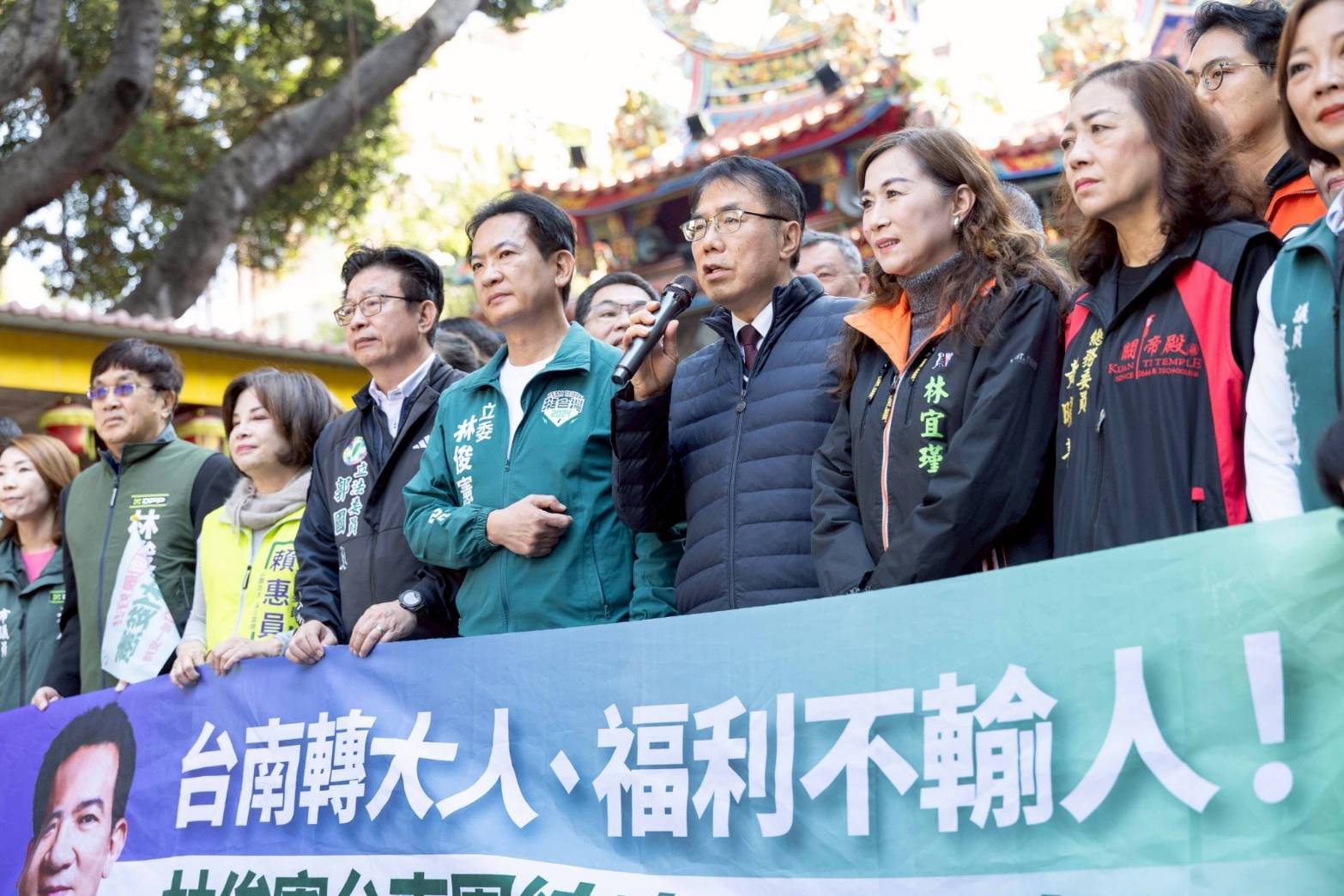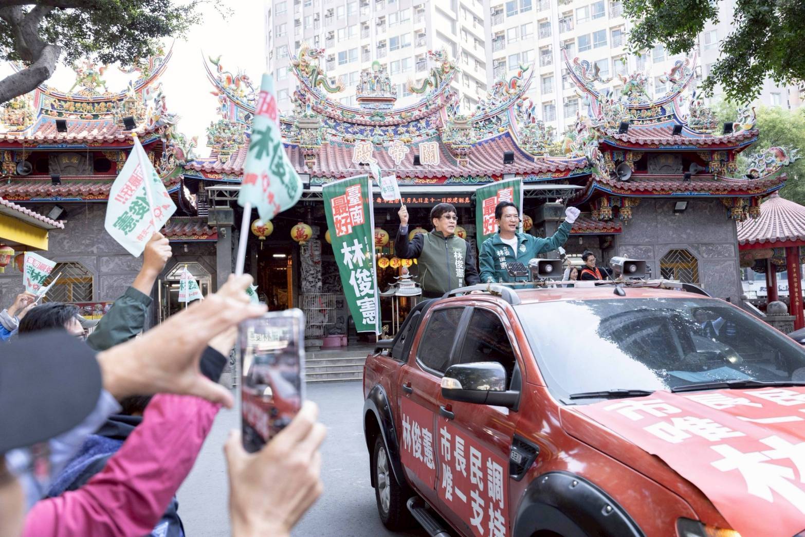 台南市長參選人林俊憲,今(11)日從東區關帝殿出發,在把握選前黃金時刻,在市區遊行爭取市民支持。在出發前,台南市長黃偉哲現身,與林俊憲共同上香祈福,期許市政順利交棒,市民生活持續進步。