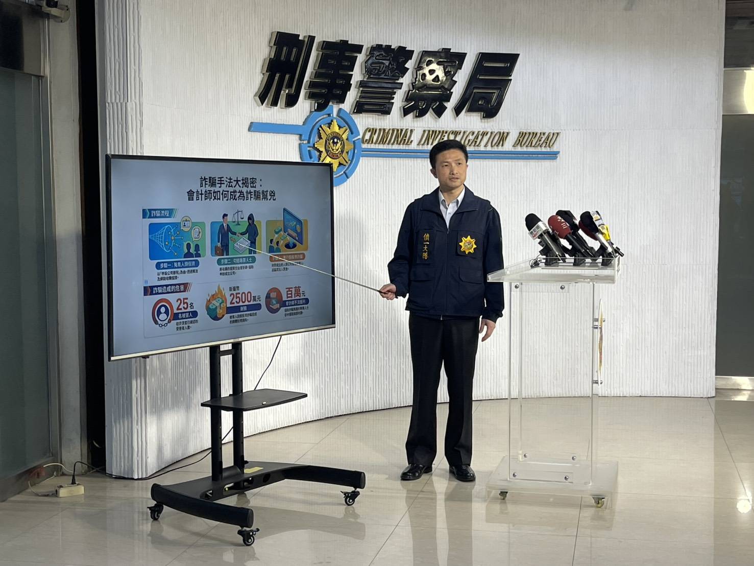 警政署刑事警察局1月13日上午10時,配合橋頭地檢署召開「刑事局破獲首宗會計師事務所助詐團設立22家人頭公司 會計師遭羈押」記者會。