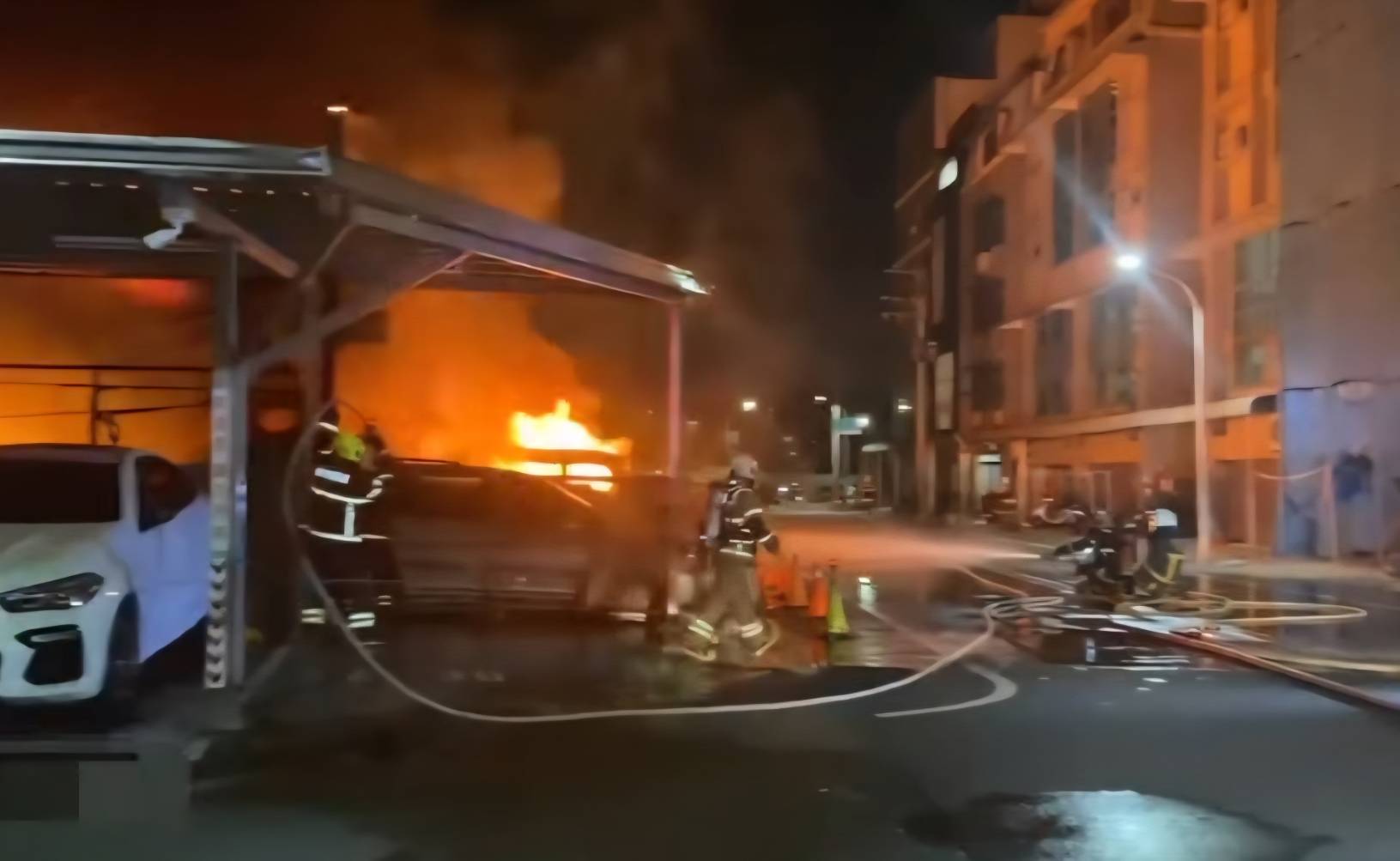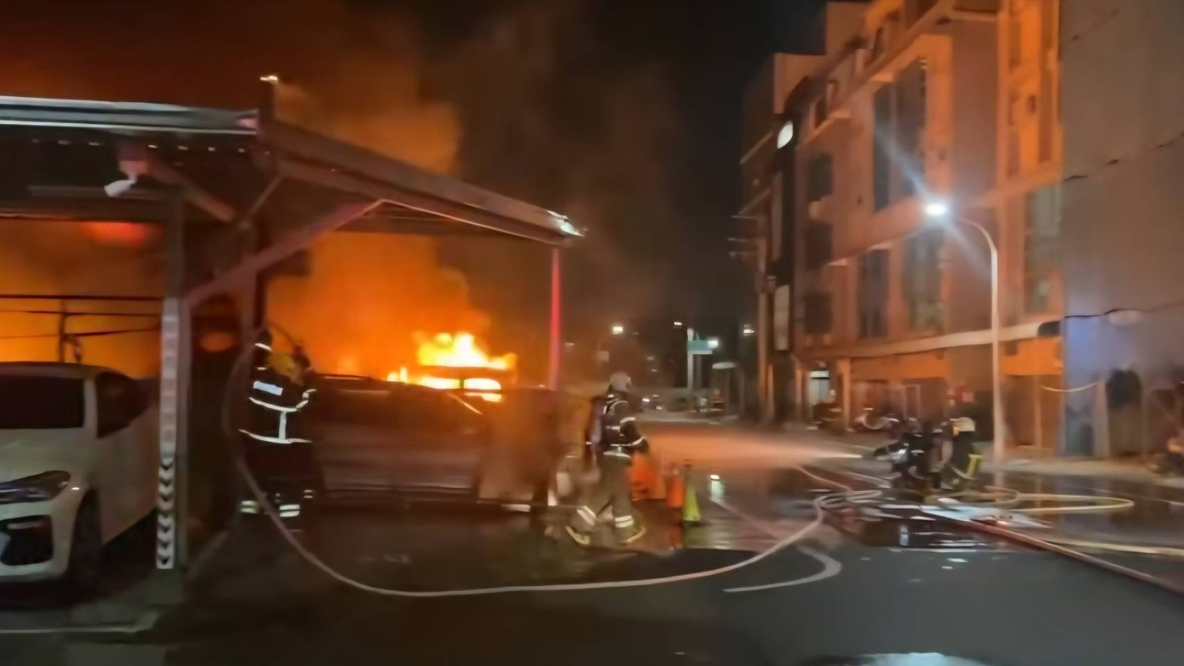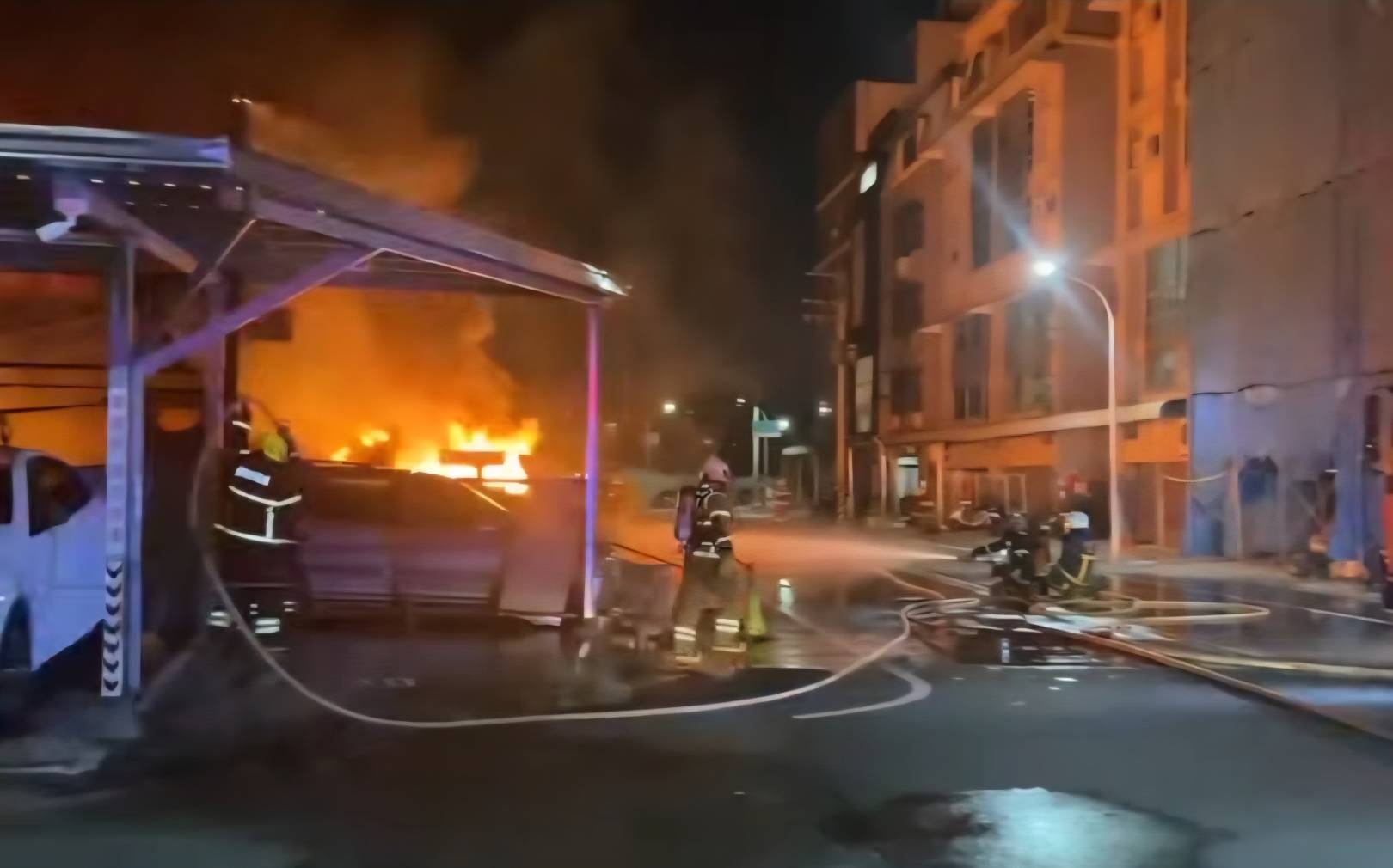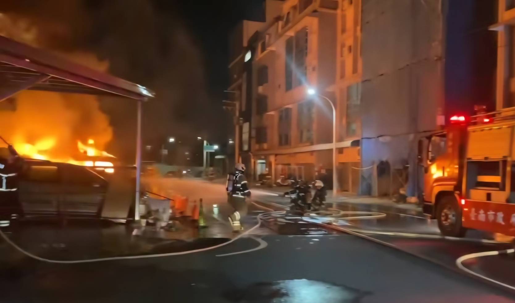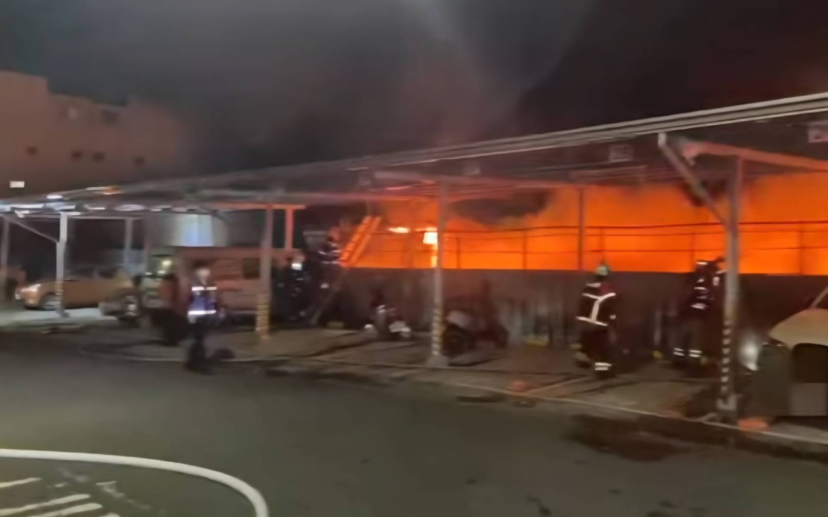 台南市消防局指出,今天(18日)晚間7時33分,119受理民眾電話報案指稱位於台南市安南區培安路356巷22號一間無招牌流當車存放場,發生火災,大火現場,冒出熊熊火光、烈焰直沖天際!