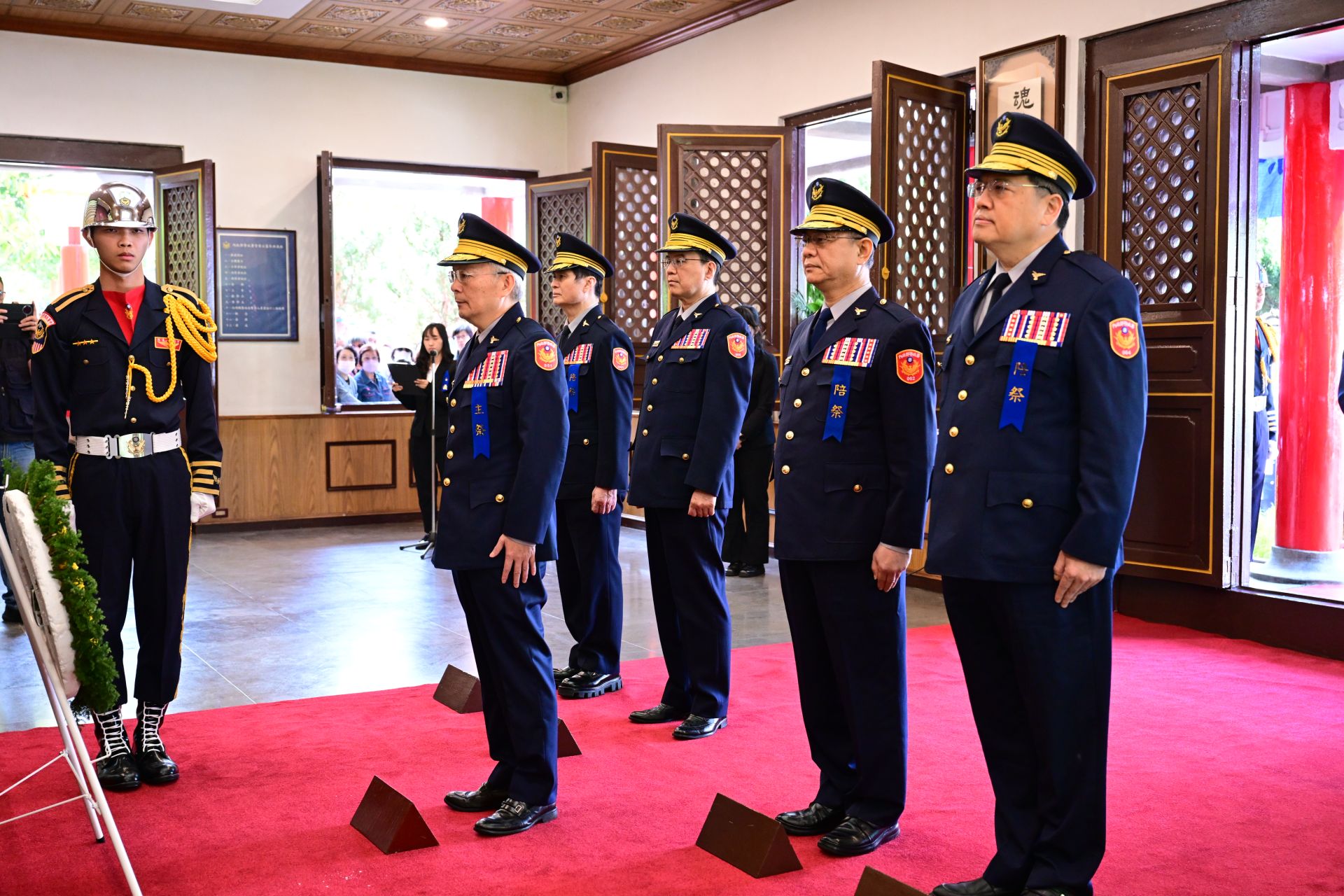 典禮開始,現場響起莊嚴樂聲,張署長向忠靈祠已故警察先賢靈位上香、獻祭品,於司儀宣讀祭文後,率同陪祭、與祭人員行三鞠躬禮及默念,感念先賢們的英勇事蹟與為國犧牲,為警察歷史寫下一頁頁光輝燦爛紀錄,並致上最深的哀悼與敬意。