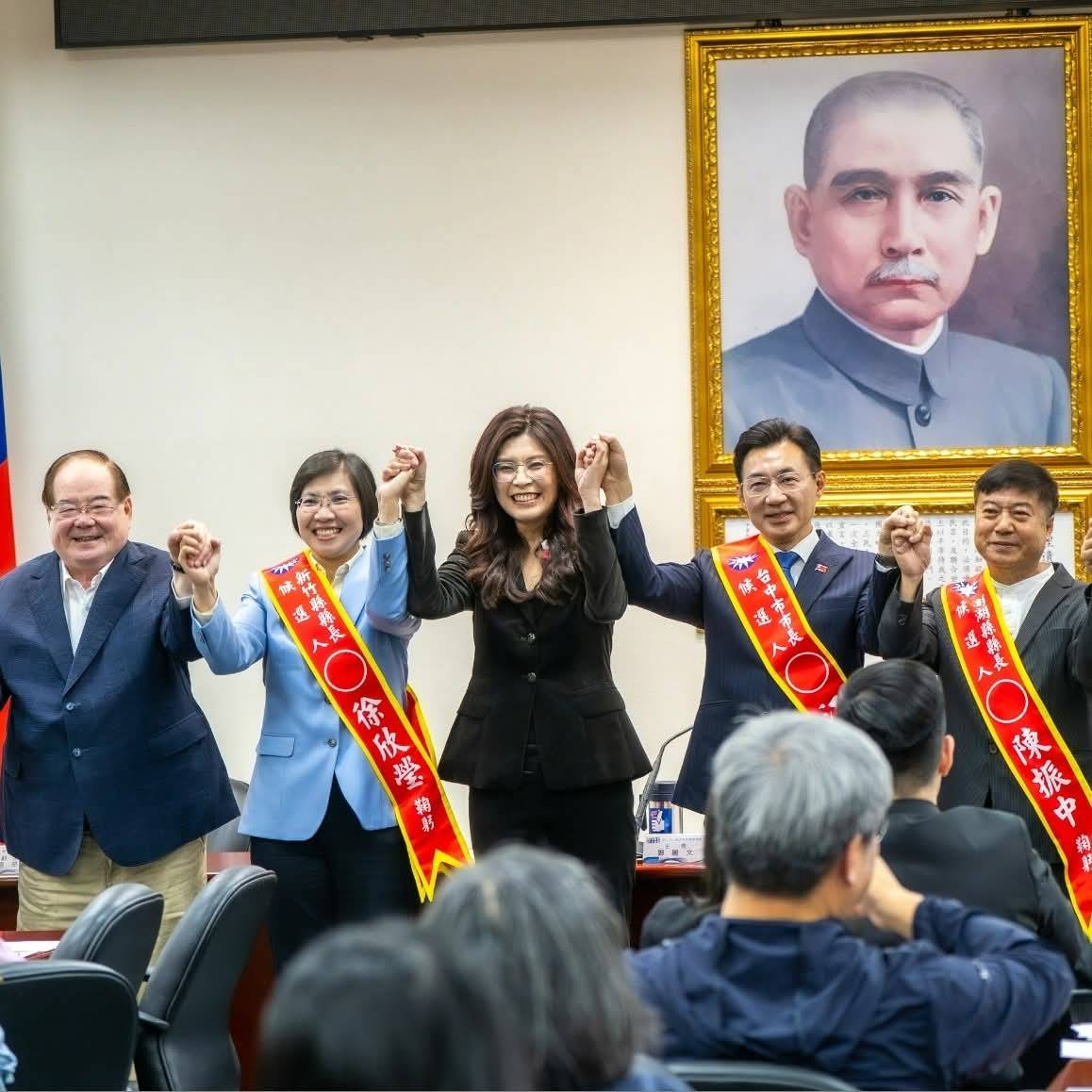 中國國民黨鄭麗文主席在常會中逐一為三位同志披掛綵帶,一一介紹徵召提名同志,並偕副主席等黨內幹部與參選同志一同牽手,齊聲高呼「勝利」、「凍蒜」,展現全黨團結氣勢,並宣誓全力輔選,預祝參選同志旗開得勝。