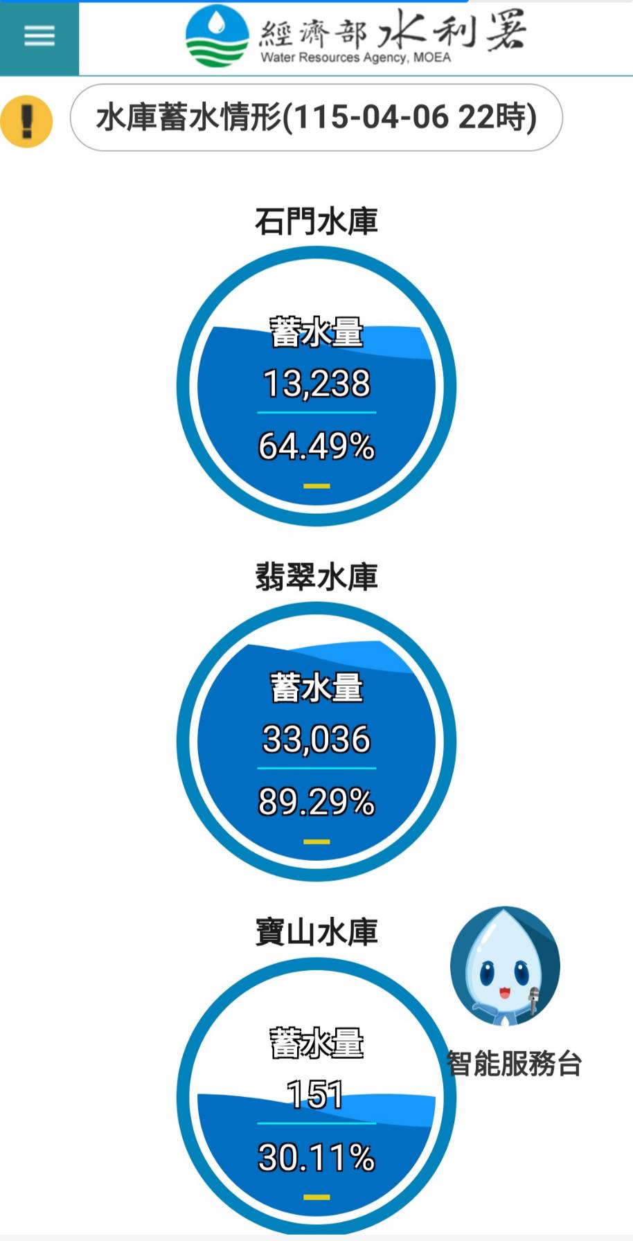 經濟部水利署公佈,全台灣北區、中區、南區,水庫目前蓄水率統計資料顯示,3月29日至4月6日對比,如下: