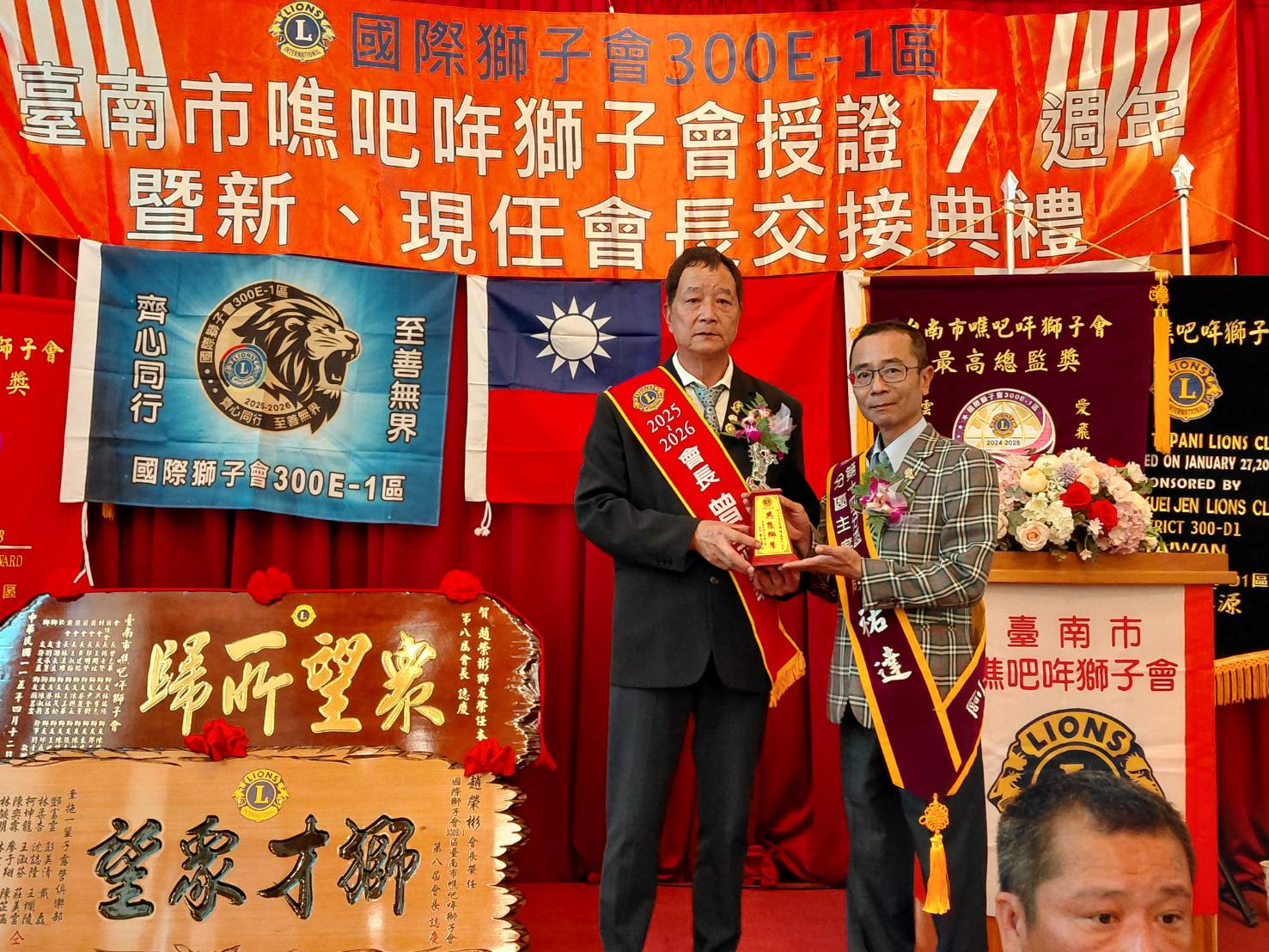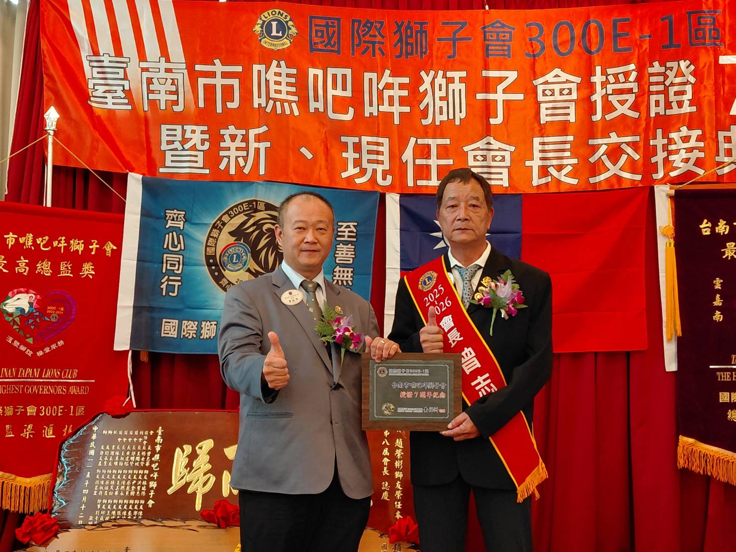 會中,由國際獅子會300E1區2025_2026年度總監總監黃裕洲親自頒發7週年紀念牌給國際獅子會300E1區台南市焦吧年獅子會會長曾志華。