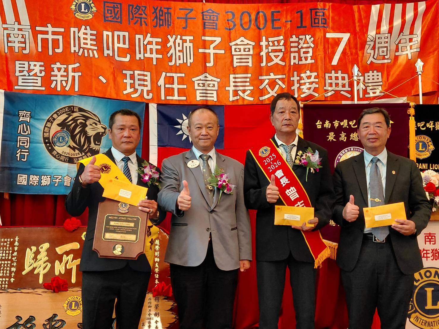 同時,國際獅子會300E1區2025_2026年度總監總監黃裕洲親自頒發LCIF國際基金捐款的國際獎章給受獎人:國際獅子會300E1區台南市焦吧年獅子會授證7週年暨新、現任會長趙榮彬、曾志華、林漢維三人。